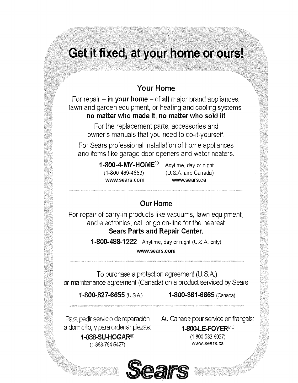 Sears Repair Parts Phone Numbers ..................................... Back Cover