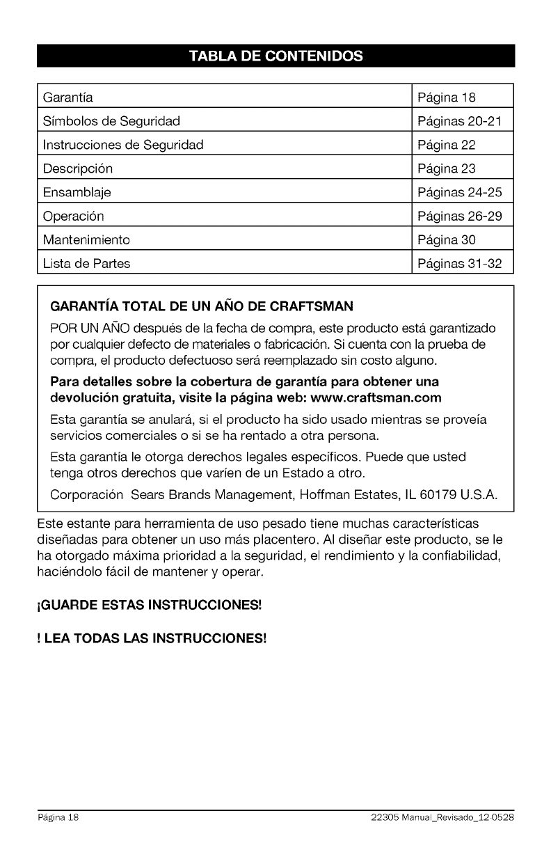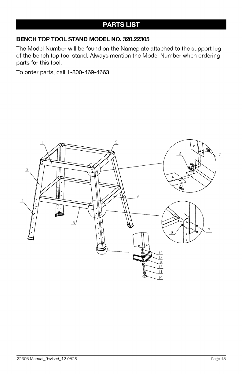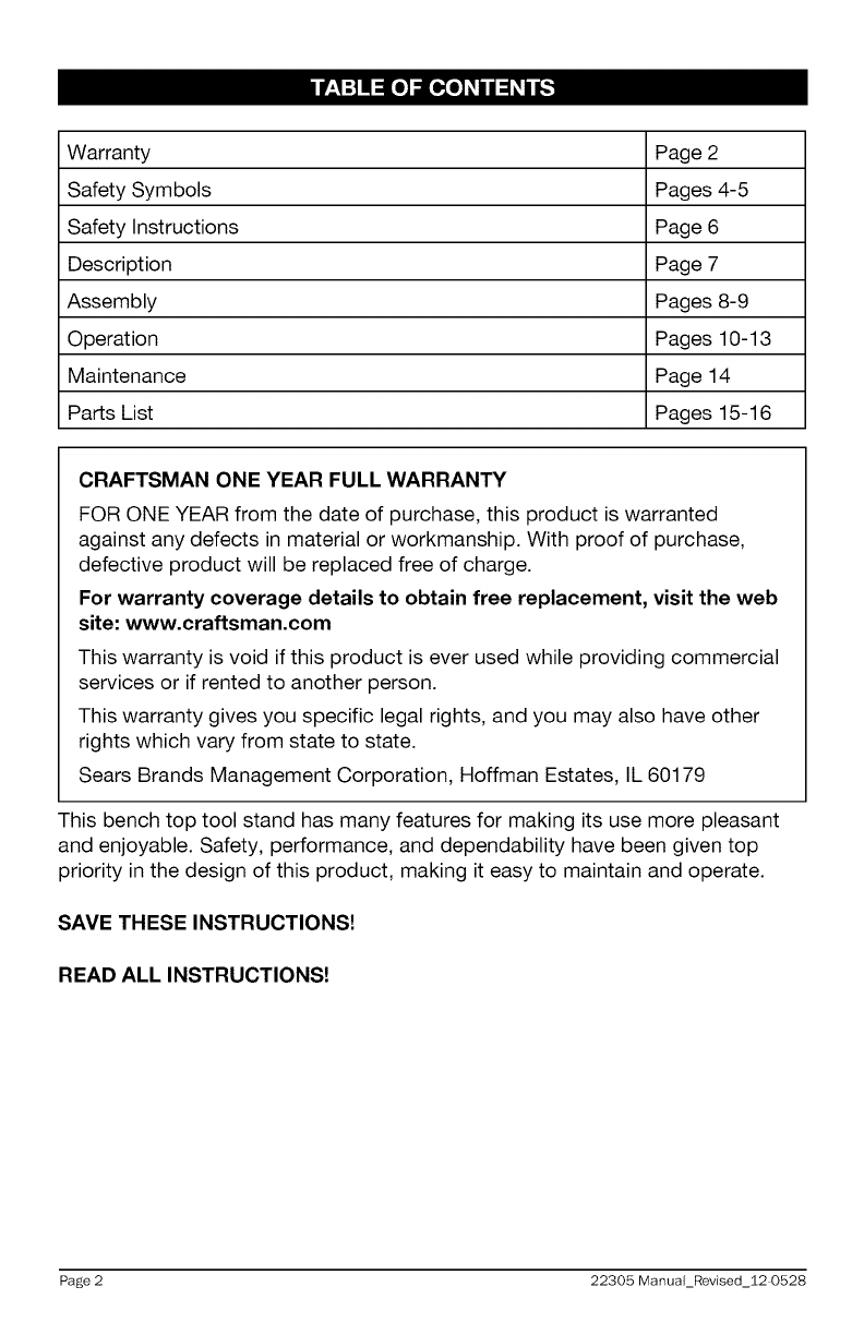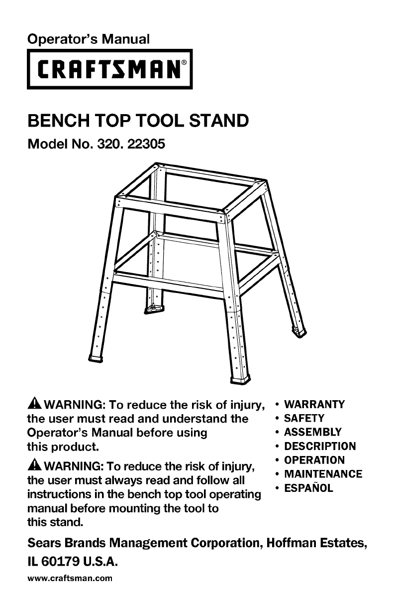 User Manual: Craftsman 32022305 32022305 CRAFTSMAN BENCH TOP TOOL STAND - Manuals and Guides View the owners manual for your CRAFTSMAN BENCH TOP TOOL STAND #32022305. Home:Tool Parts:Craftsman Parts:Craftsman BENCH TOP TOOL STAND Manual