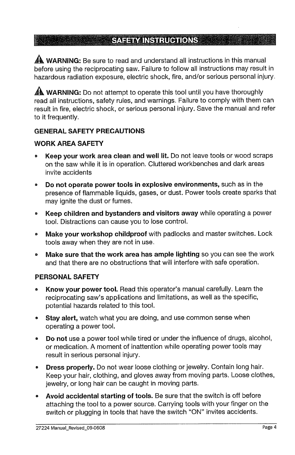 and "CAUTION," before using this Reciprocating Saw. Failure to following all