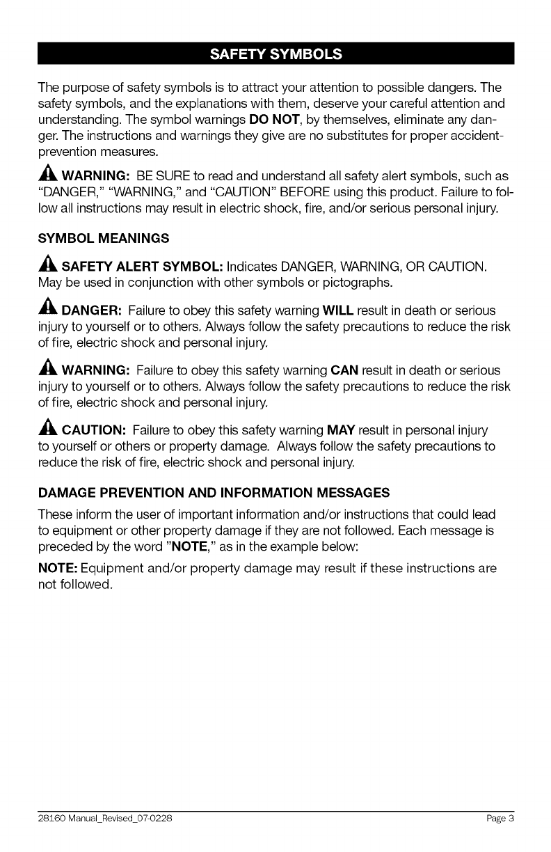 _, WARNING: BE SURE to read and understand all safety alert symbols, such as