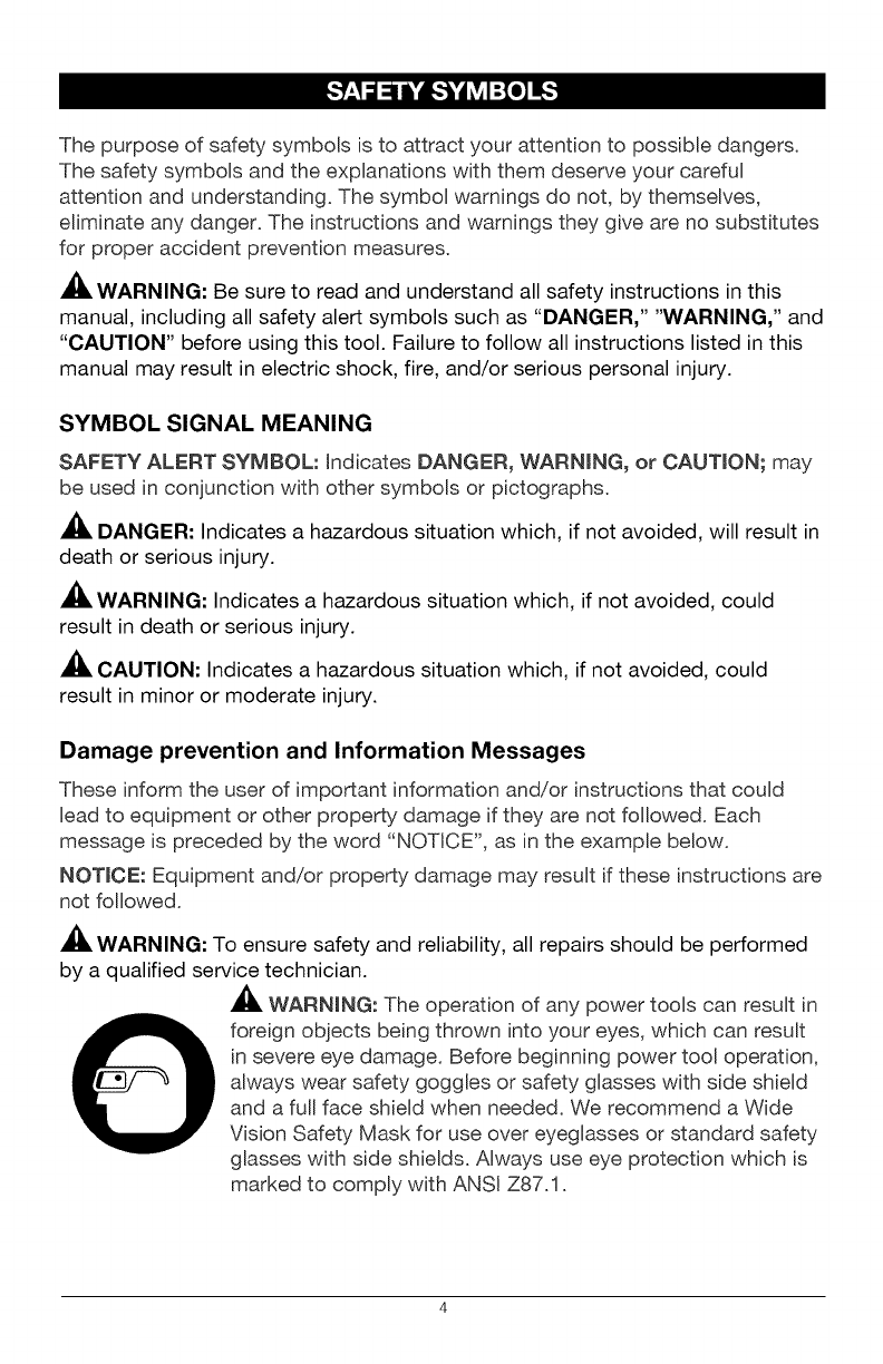 manual, including all safety alert symbols such as "DANGER," "WARNING," and