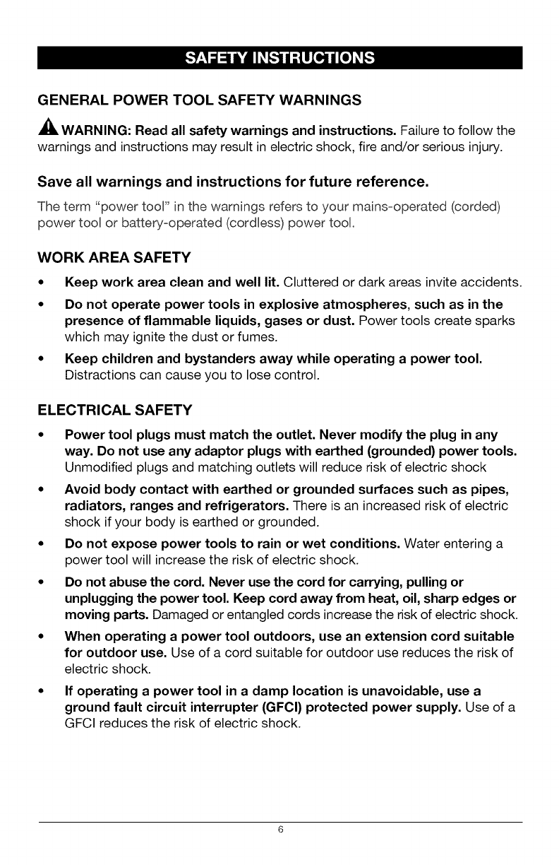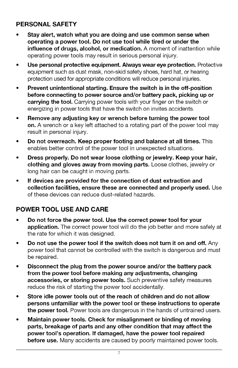 in severe eye damage. Before beginning power tool operation,