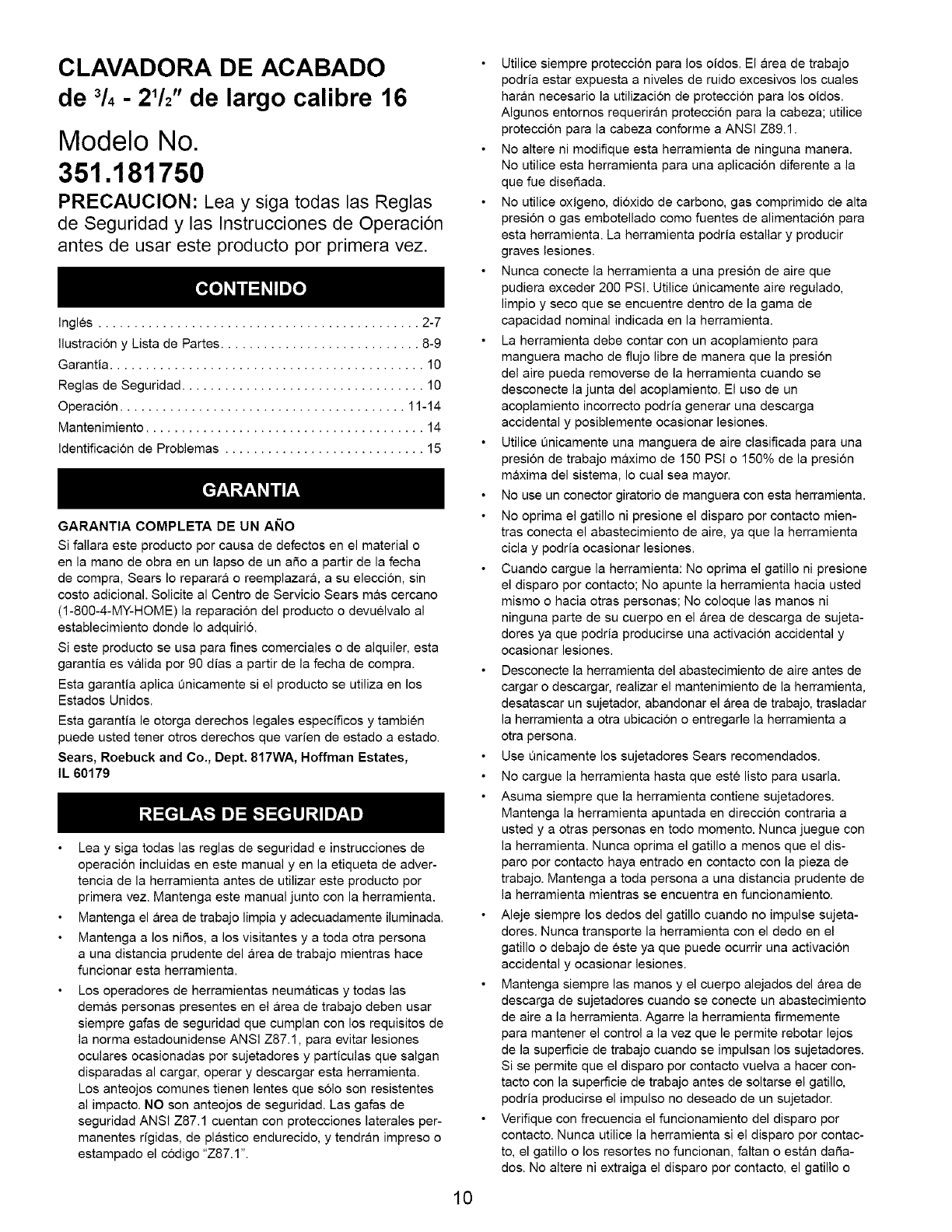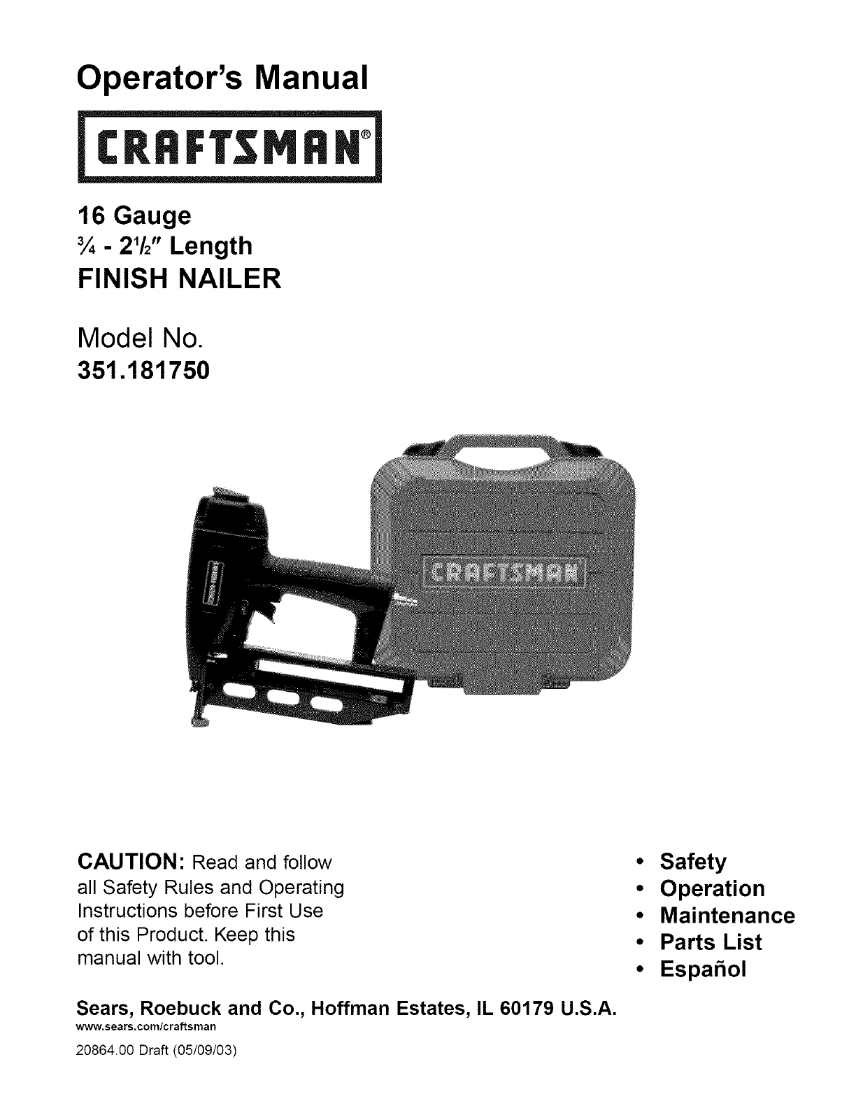 User Manual: Craftsman 351181750 351181750 CRAFTSMAN NAILER - Manuals and Guides View the owners manual for your CRAFTSMAN NAILER #351181750. Home:Tool Parts:Craftsman Parts:Craftsman NAILER Manual