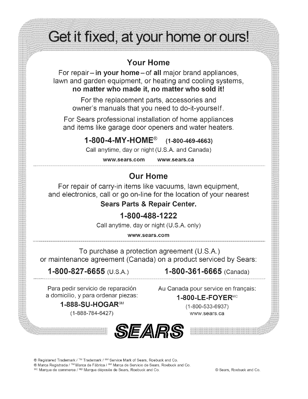 ® Mama Registrada /TM Marca de Fabrica /SM Marca de Servicio de Sears, Roebuck and Co.