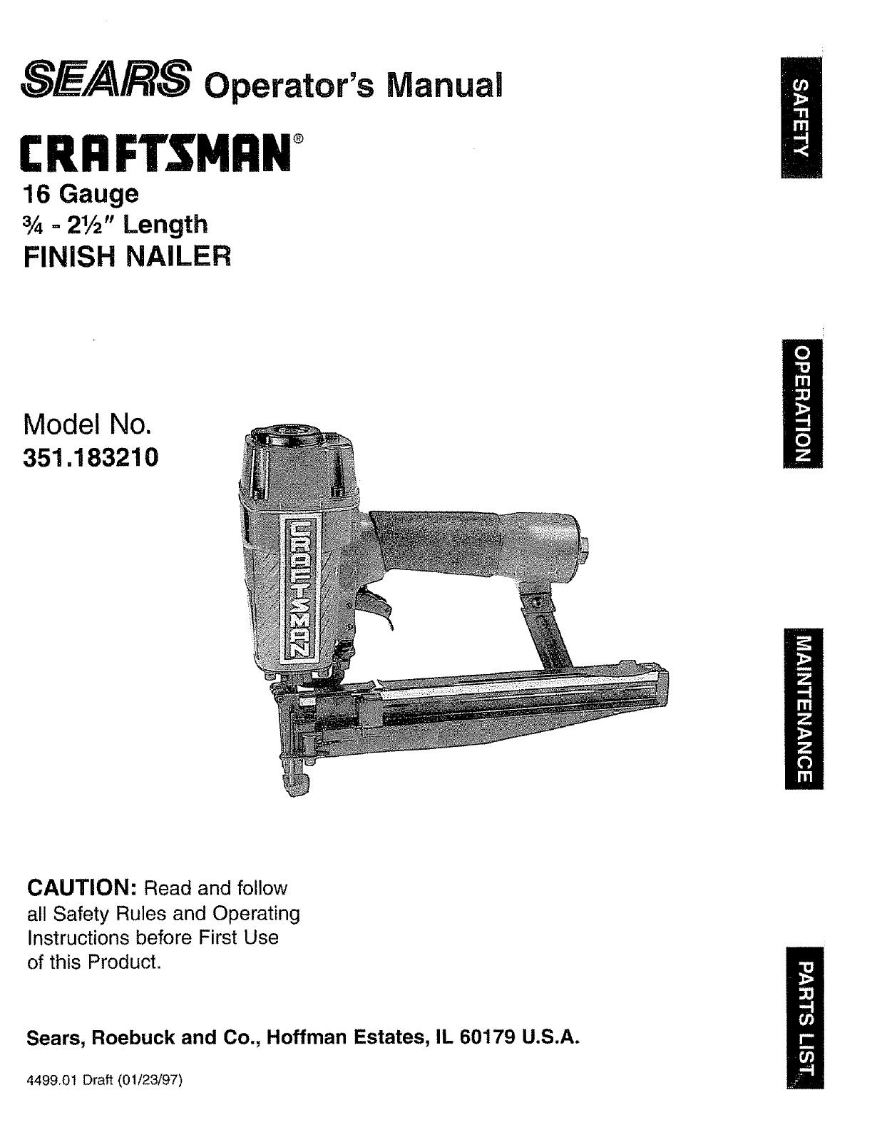 User Manual: Craftsman 351183210 351183210 CRAFTSMAN NAILER - Manuals and Guides View the owners manual for your CRAFTSMAN NAILER #351183210. Home:Tool Parts:Craftsman Parts:Craftsman NAILER Manual
