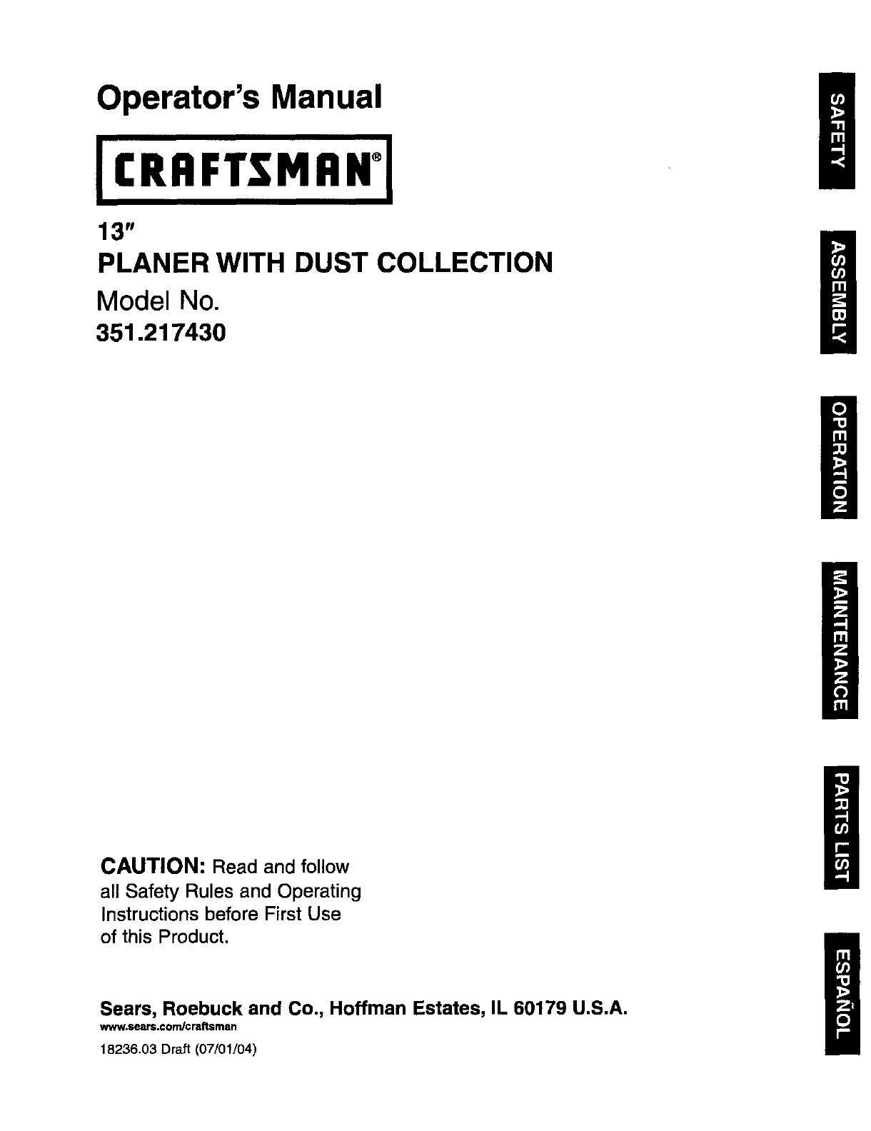 User Manual: Craftsman 351217430 351217430 CRAFTSMAN PLANER - Manuals and Guides View the owners manual for your CRAFTSMAN PLANER #351217430. Home:Tool Parts:Craftsman Parts:Craftsman PLANER Manual
