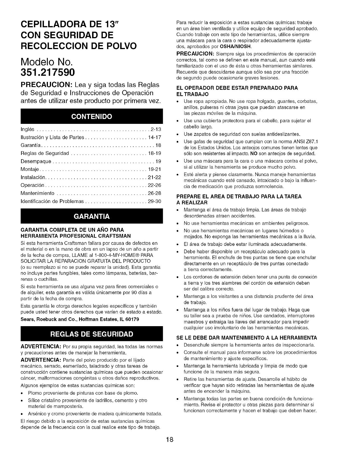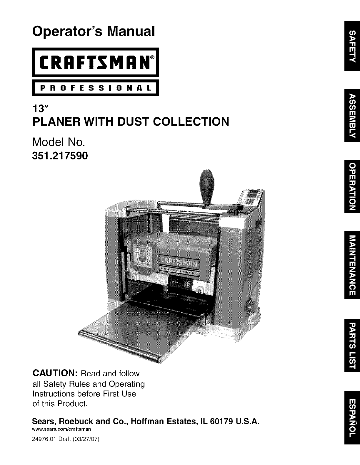 User Manual: Craftsman 351217590 351217590 CRAFTSMAN PLANER - Manuals and Guides View the owners manual for your CRAFTSMAN PLANER #351217590. Home:Tool Parts:Craftsman Parts:Craftsman PLANER Manual