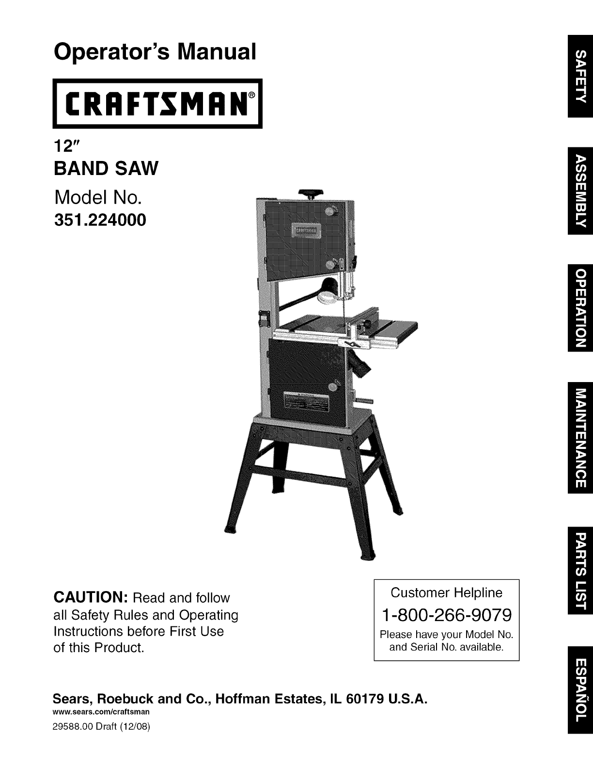 User Manual: Craftsman 351224000 351224000 CRAFTSMAN BANDSAW - Manuals and Guides View the owners manual for your CRAFTSMAN BANDSAW #351224000. Home:Tool Parts:Craftsman Parts:Craftsman BANDSAW Manual