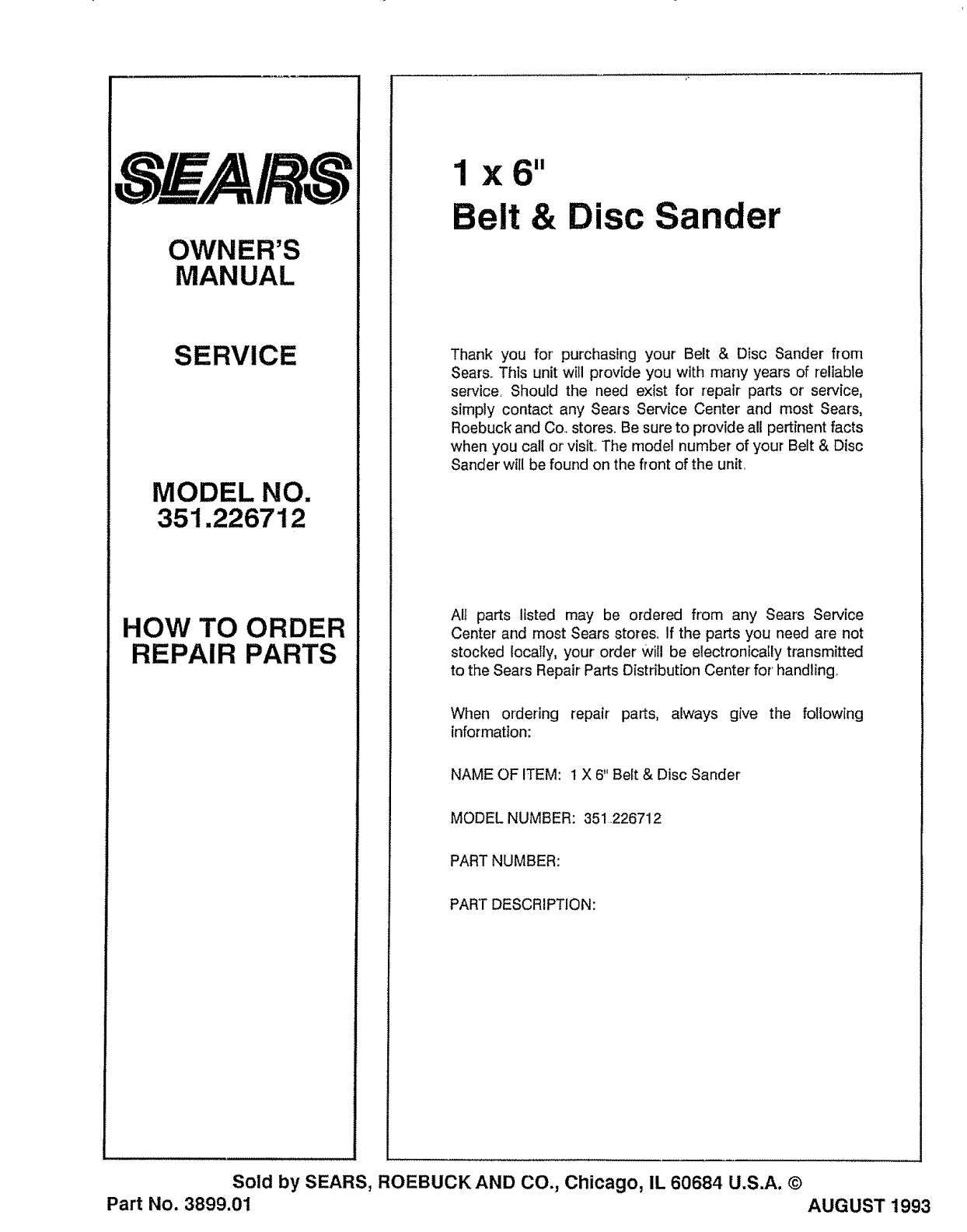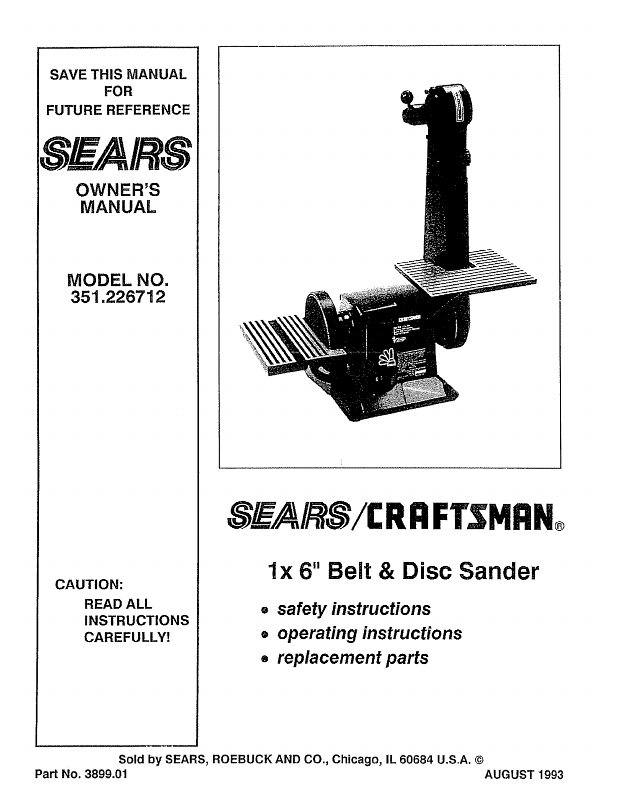 User Manual: Craftsman 351226712 351226712 CRAFTSMAN BELT AND DISC SANDER - Manuals and Guides View the owners manual for your CRAFTSMAN BELT AND DISC SANDER #351226712. Home:Tool Parts:Craftsman Parts:Craftsman BELT AND DISC SANDER Manual