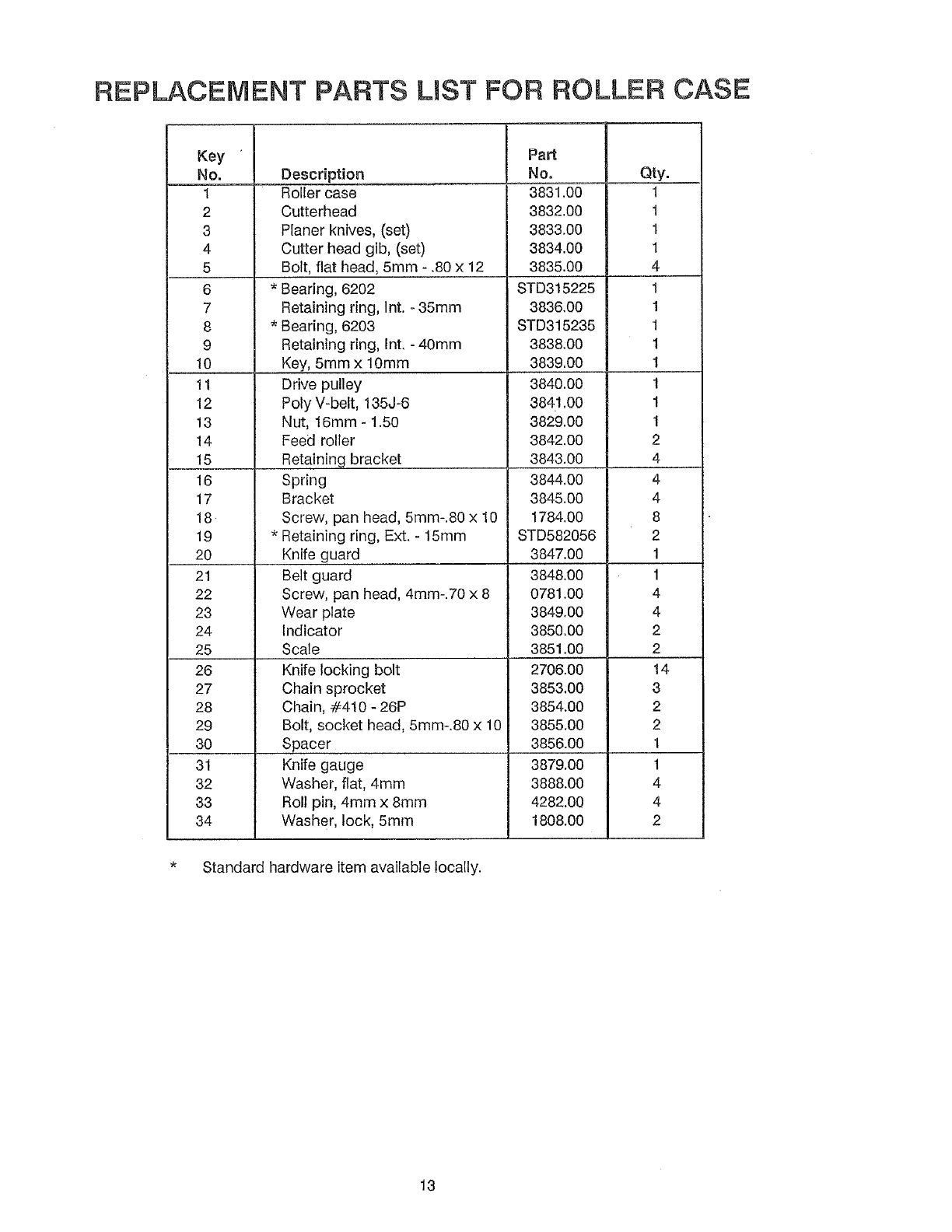 * Standard hardware item, available Iocally.
