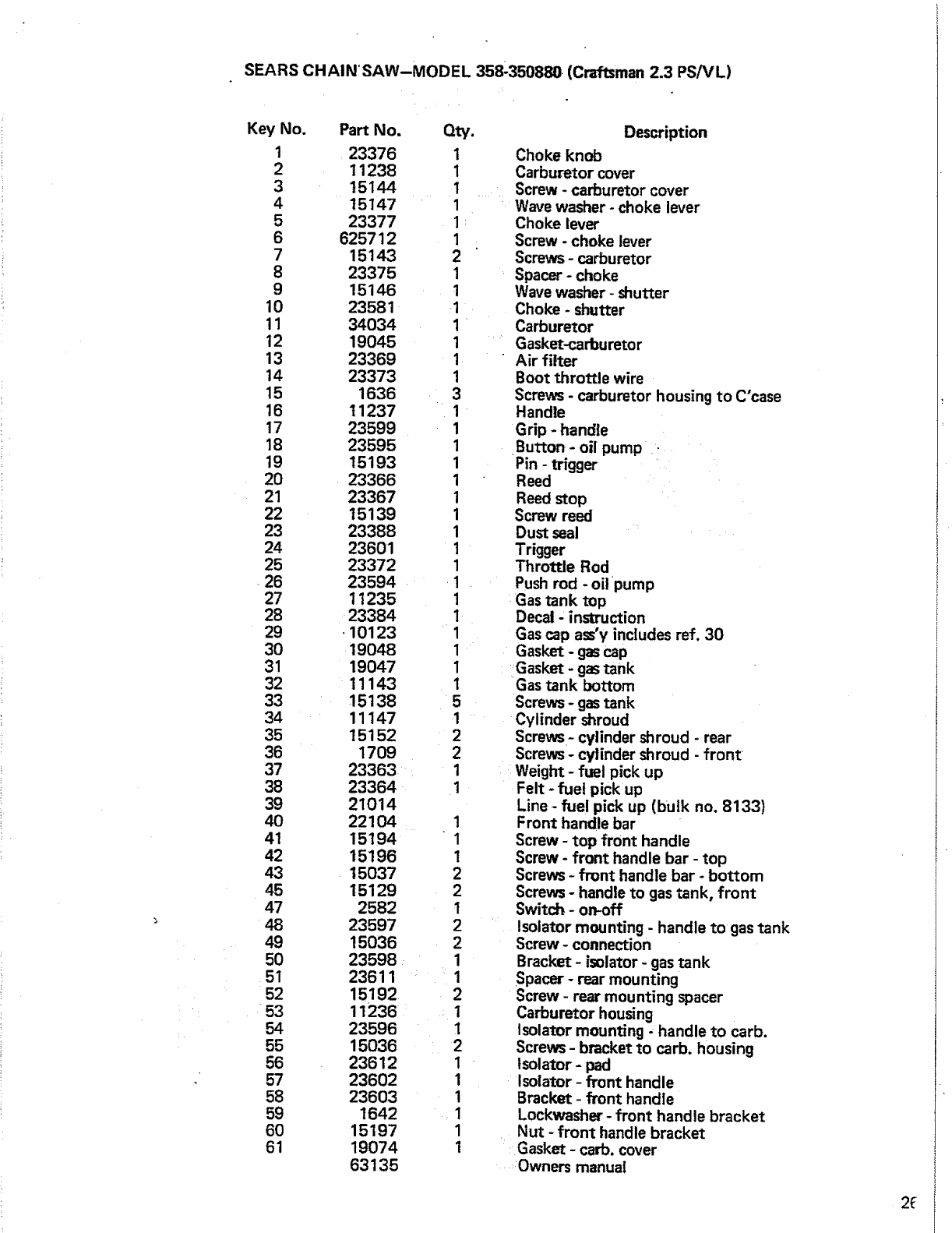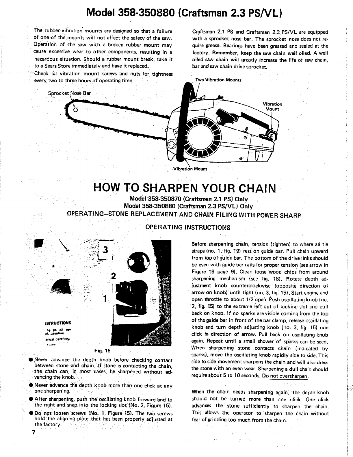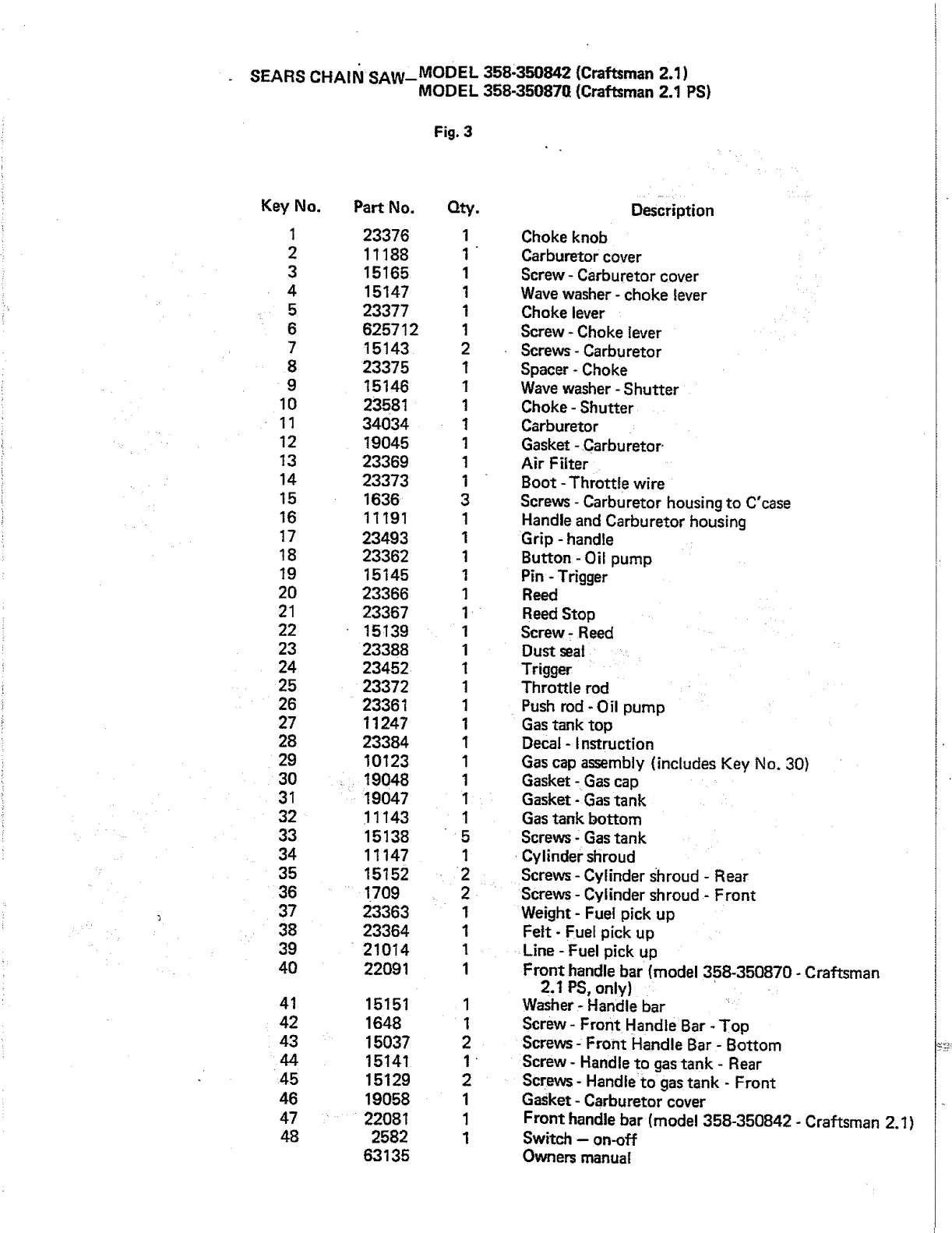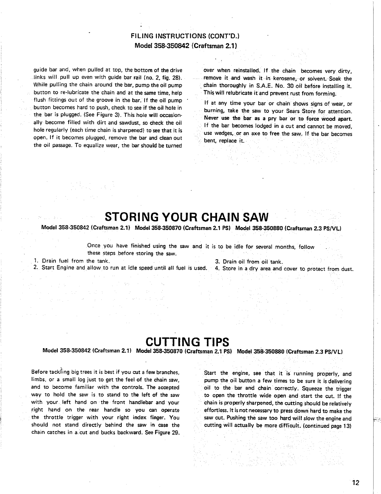 User Manual: Craftsman 358350842 358350842 CRAFTSMAN SEARS CHAIN SAWS - Manuals and Guides View the owners manual for your CRAFTSMAN SEARS CHAIN SAWS #358350842. Home:Lawn & Garden Parts:Craftsman Parts:Craftsman SEARS CHAIN SAWS Manual
