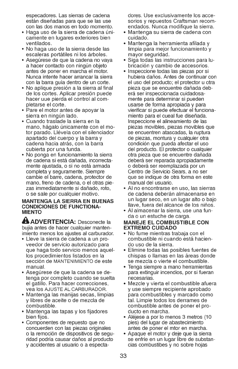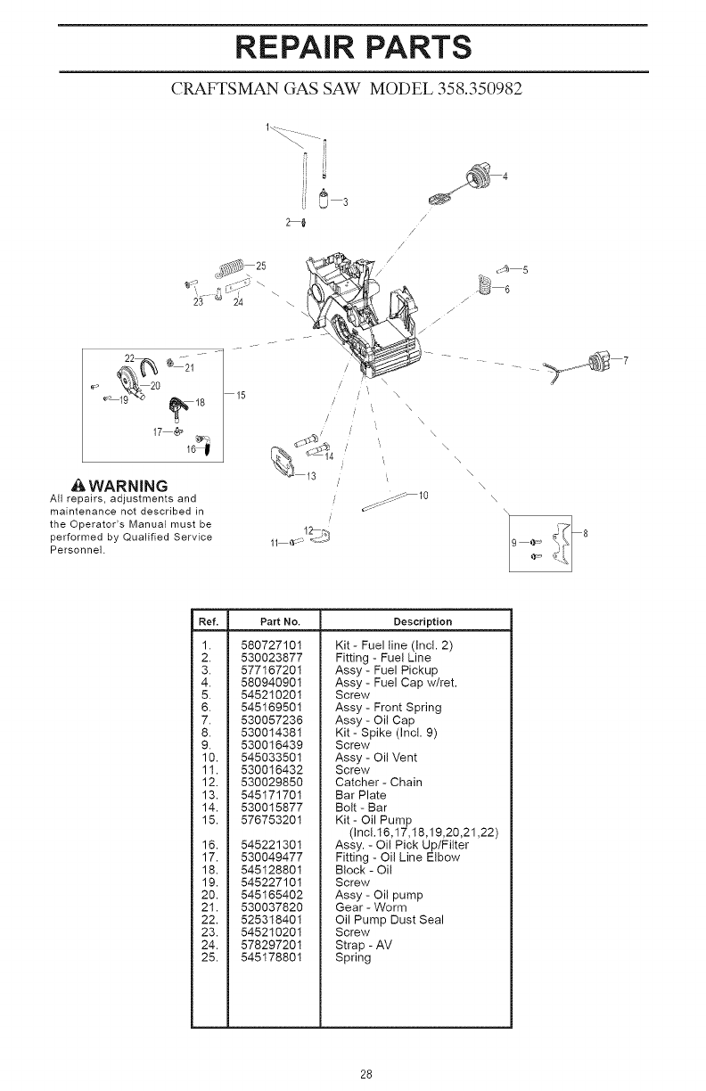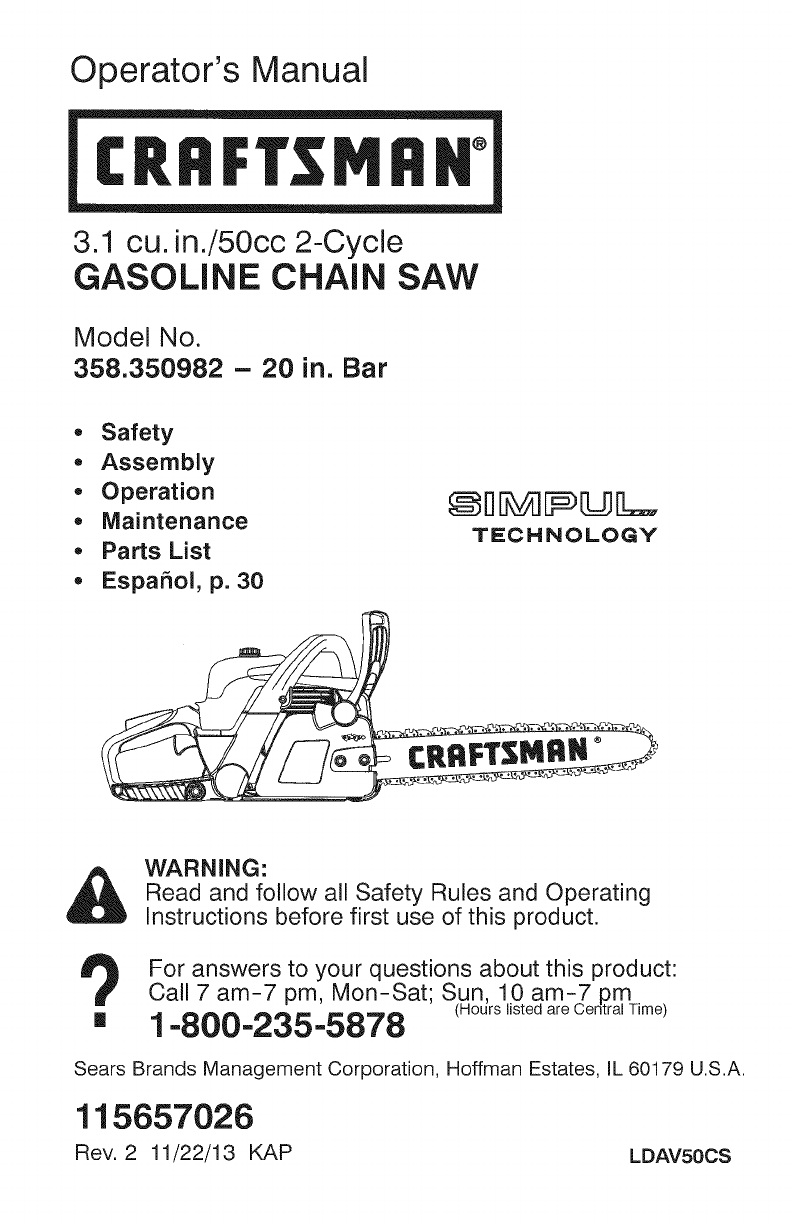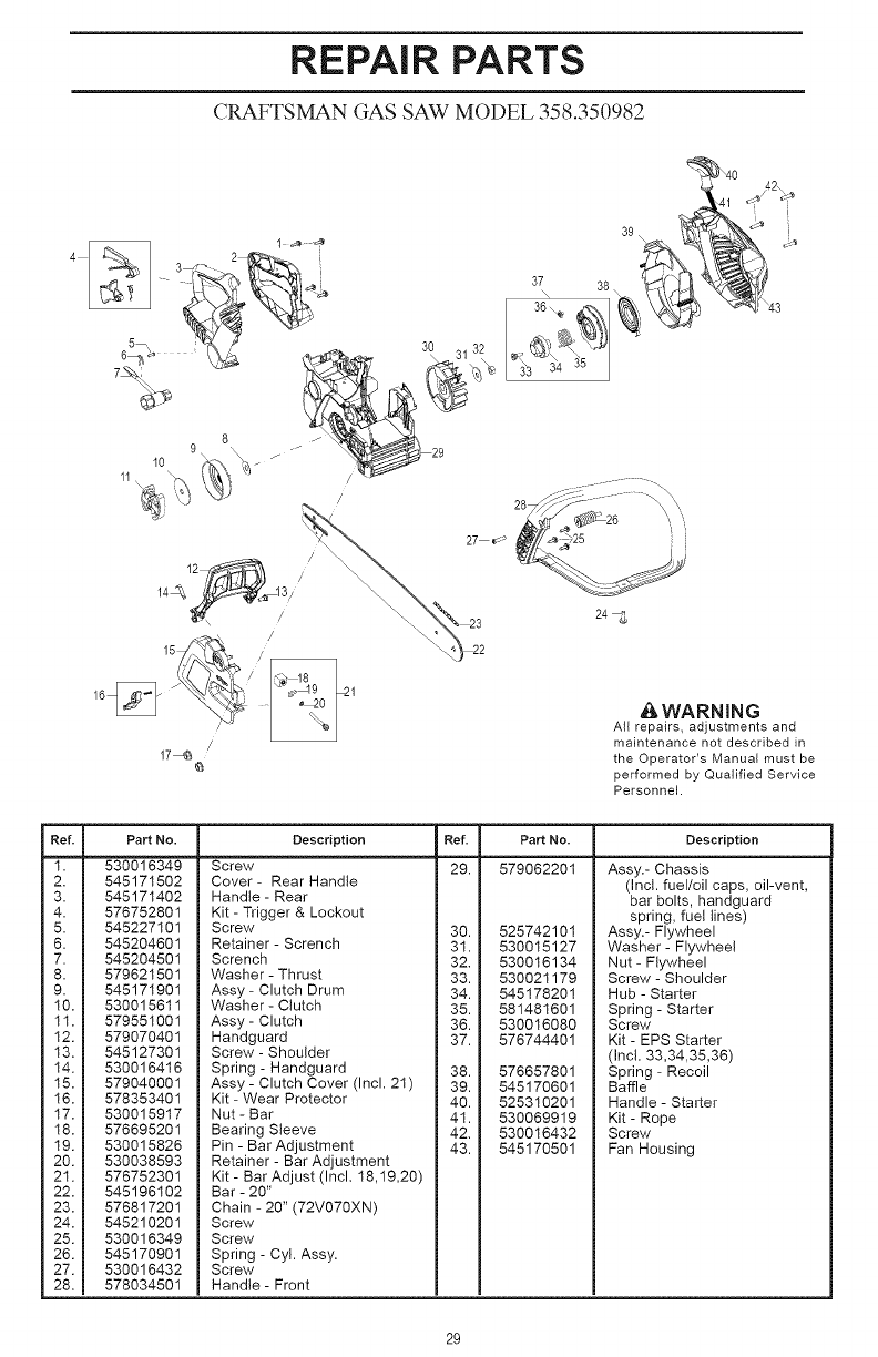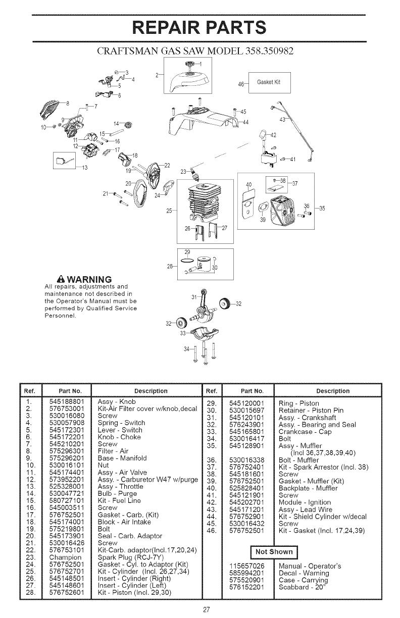 User Manual: Craftsman 358350982 358350982 CRAFTSMAN CHAIN SAW - Manuals and Guides View the owners manual for your CRAFTSMAN CHAIN SAW #358350982. Home:Lawn & Garden Parts:Craftsman Parts:Craftsman CHAIN SAW Manual