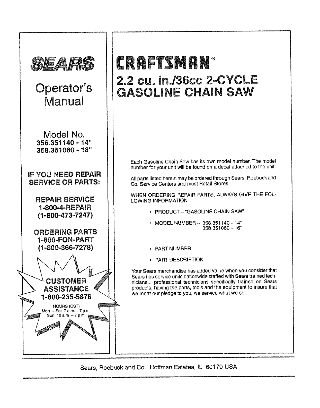 User Manual: Craftsman 358351060 358351060 CRAFTSMAN CHAIN SAW - Manuals and Guides View the owners manual for your CRAFTSMAN CHAIN SAW #358351060. Home:Lawn & Garden Parts:Craftsman Parts:Craftsman CHAIN SAW Manual