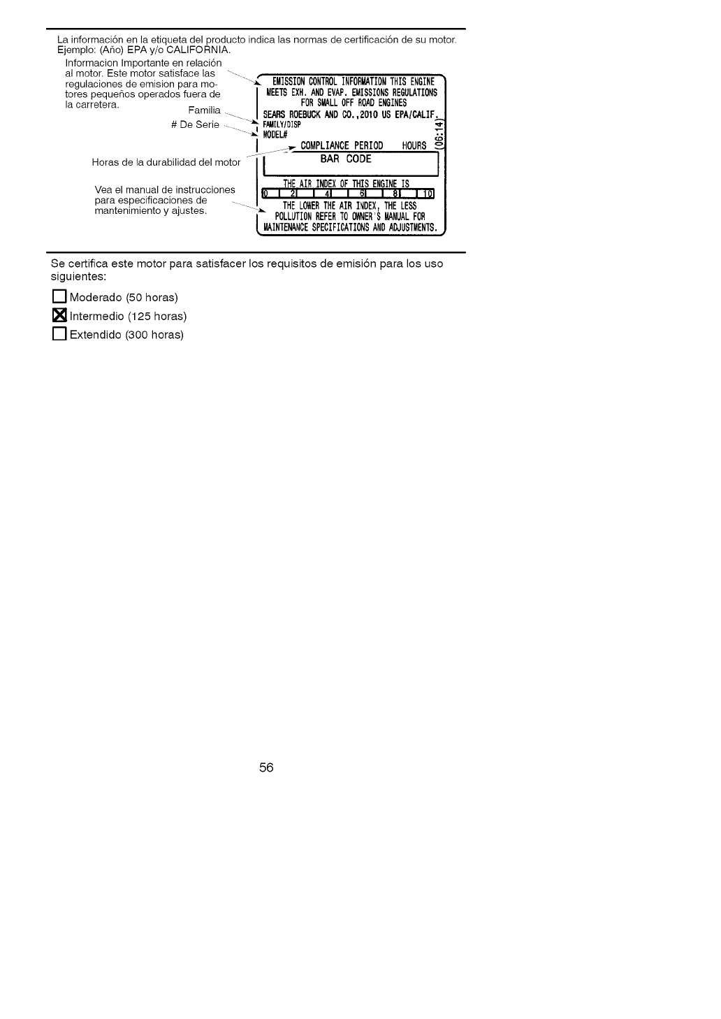 La informaciCn en la etiqueta del producto indica los normas de certificaciCn de su motor.