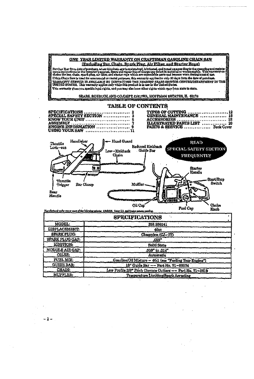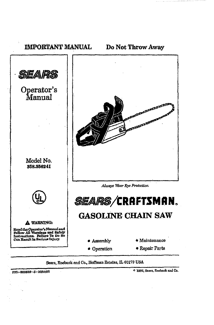 Craftsman 358356240 User Manual Gas, Chainsaw Manuals And Guides L0801184