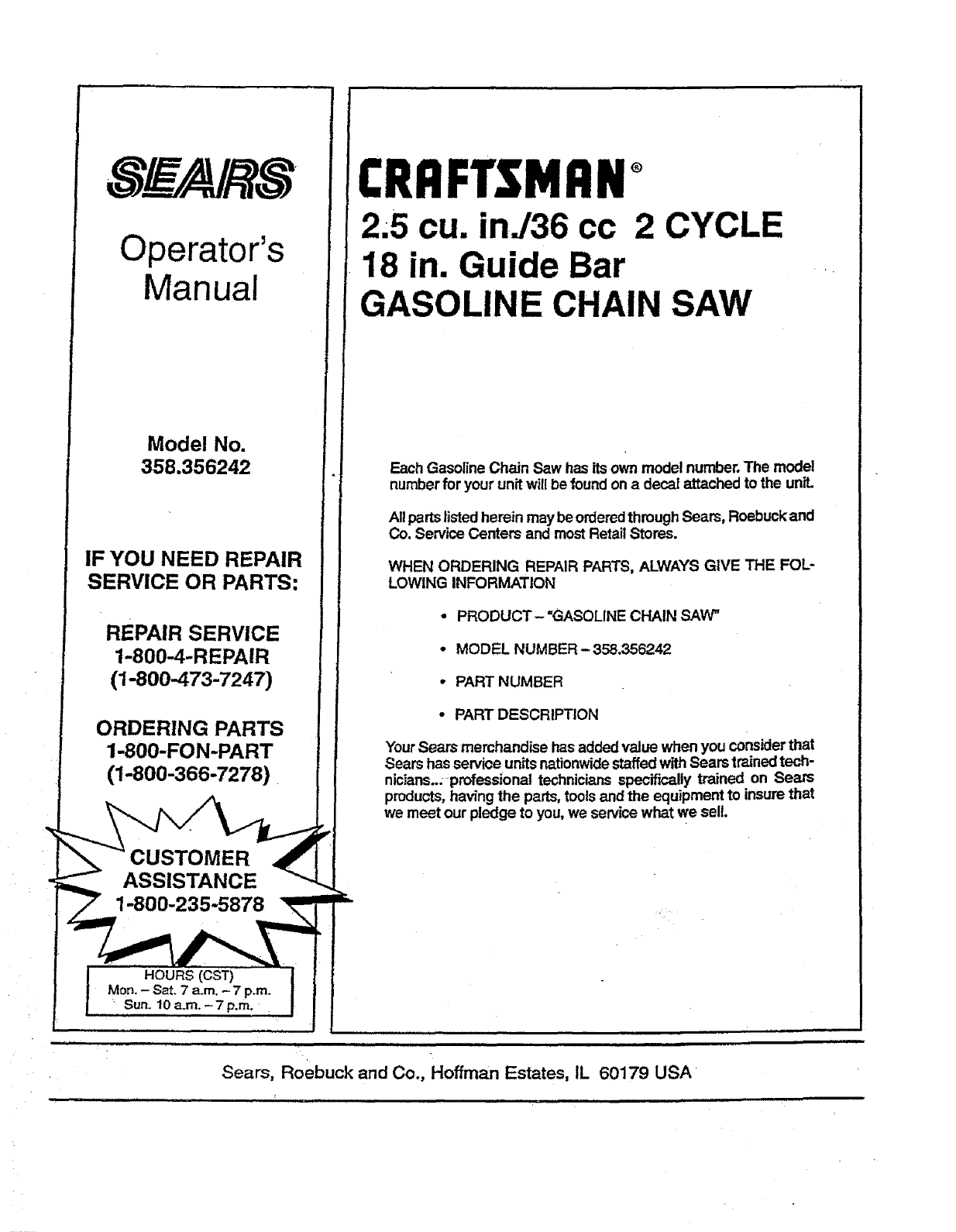 User Manual: Craftsman 358356242 358356242 CRAFTSMAN Gas, Chainsaw - Manuals and Guides View the owners manual for your CRAFTSMAN Gas, Chainsaw #358356242. Home:Lawn & Garden Parts:Craftsman Parts:Craftsman Gas, Chainsaw Manual