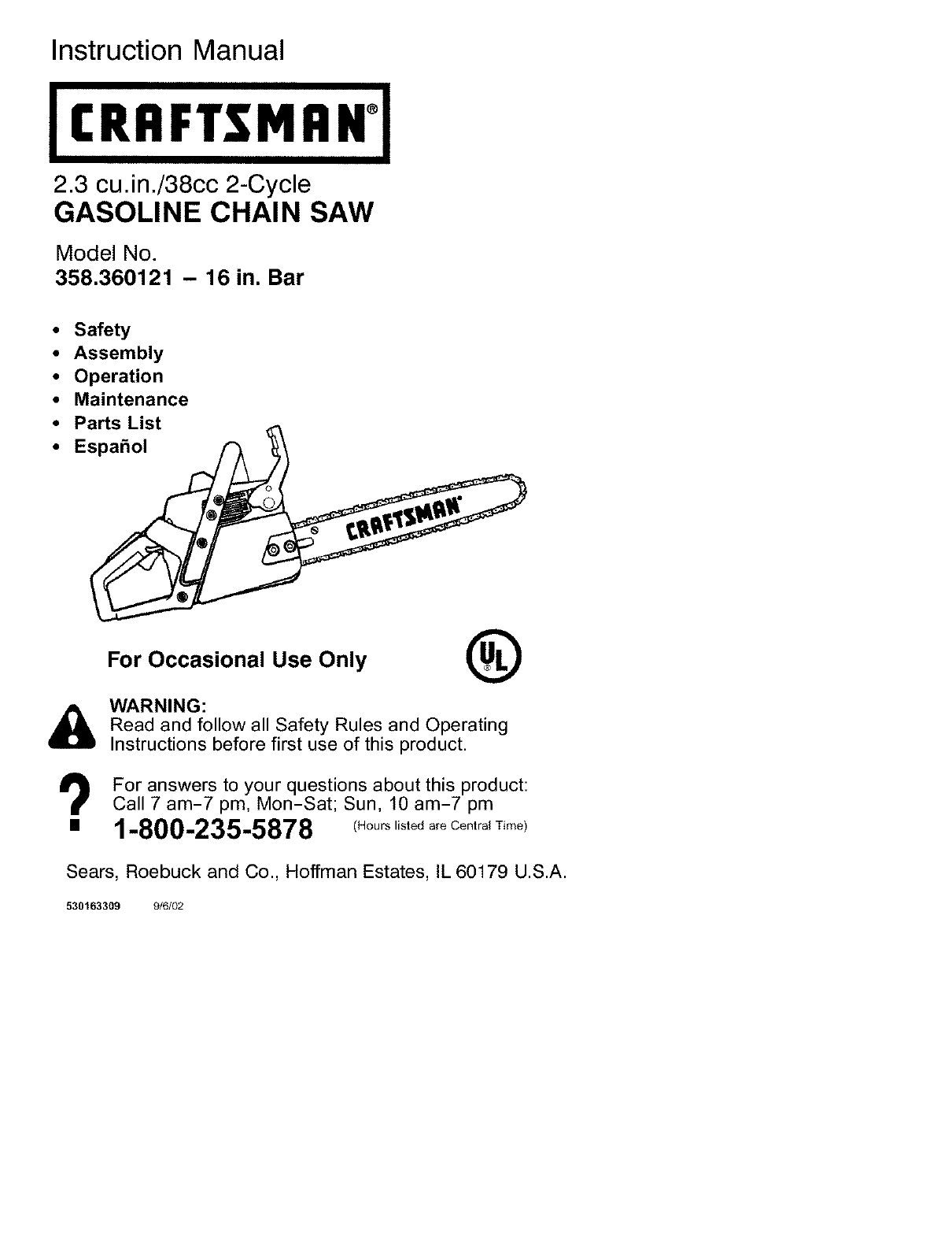 User Manual: Craftsman 358360121 358360121 CRAFTSMAN CHAIN SAW - Manuals and Guides View the owners manual for your CRAFTSMAN CHAIN SAW #358360121. Home:Lawn & Garden Parts:Craftsman Parts:Craftsman CHAIN SAW Manual