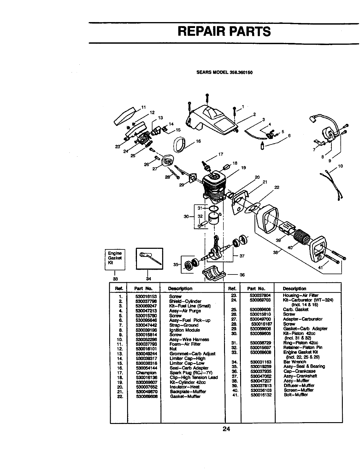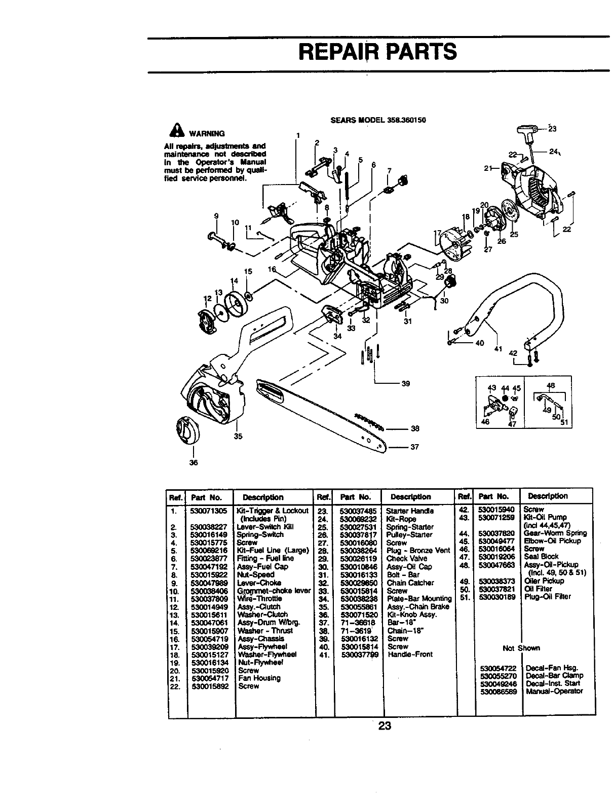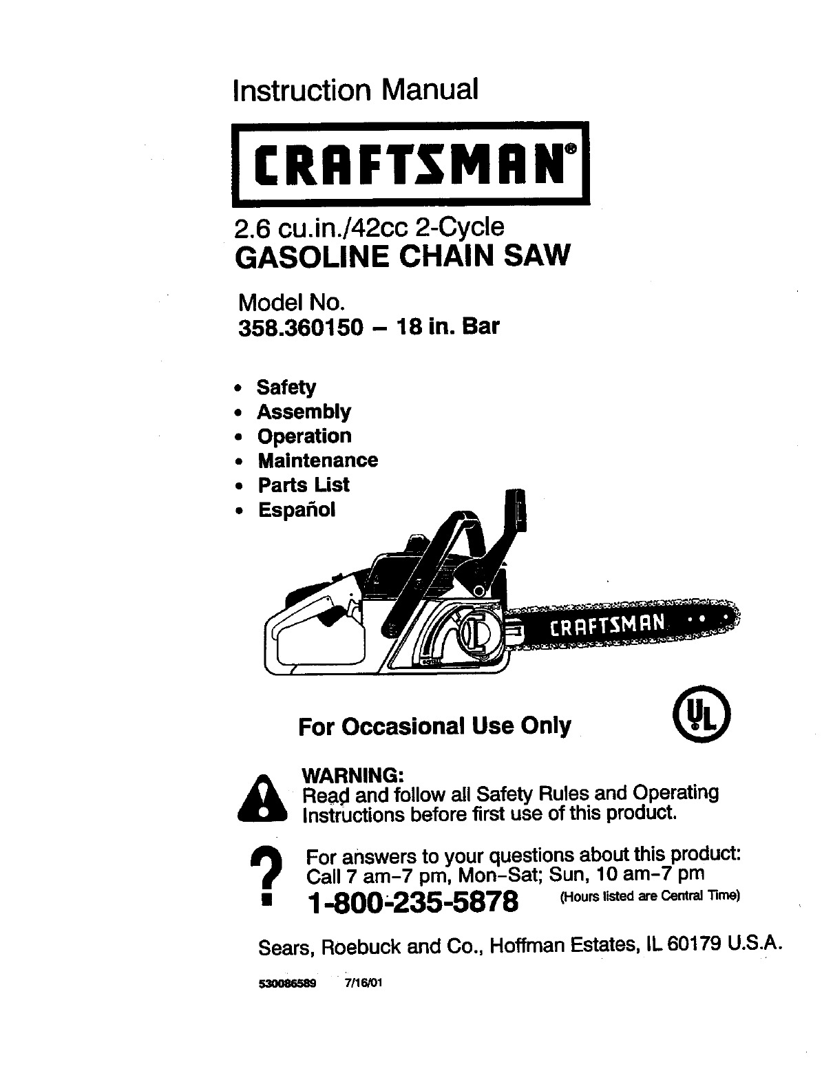 User Manual: Craftsman 358360150 358360150 CRAFTSMAN CHAIN SAW - Manuals and Guides View the owners manual for your CRAFTSMAN CHAIN SAW #358360150. Home:Lawn & Garden Parts:Craftsman Parts:Craftsman CHAIN SAW Manual