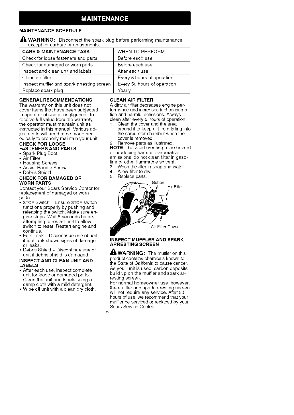 This warranty excludes cutting line, spark plug and air filter, which are expendable