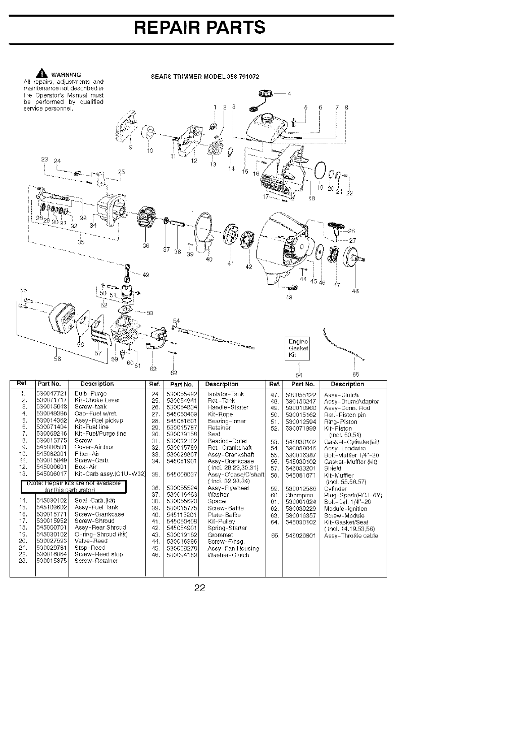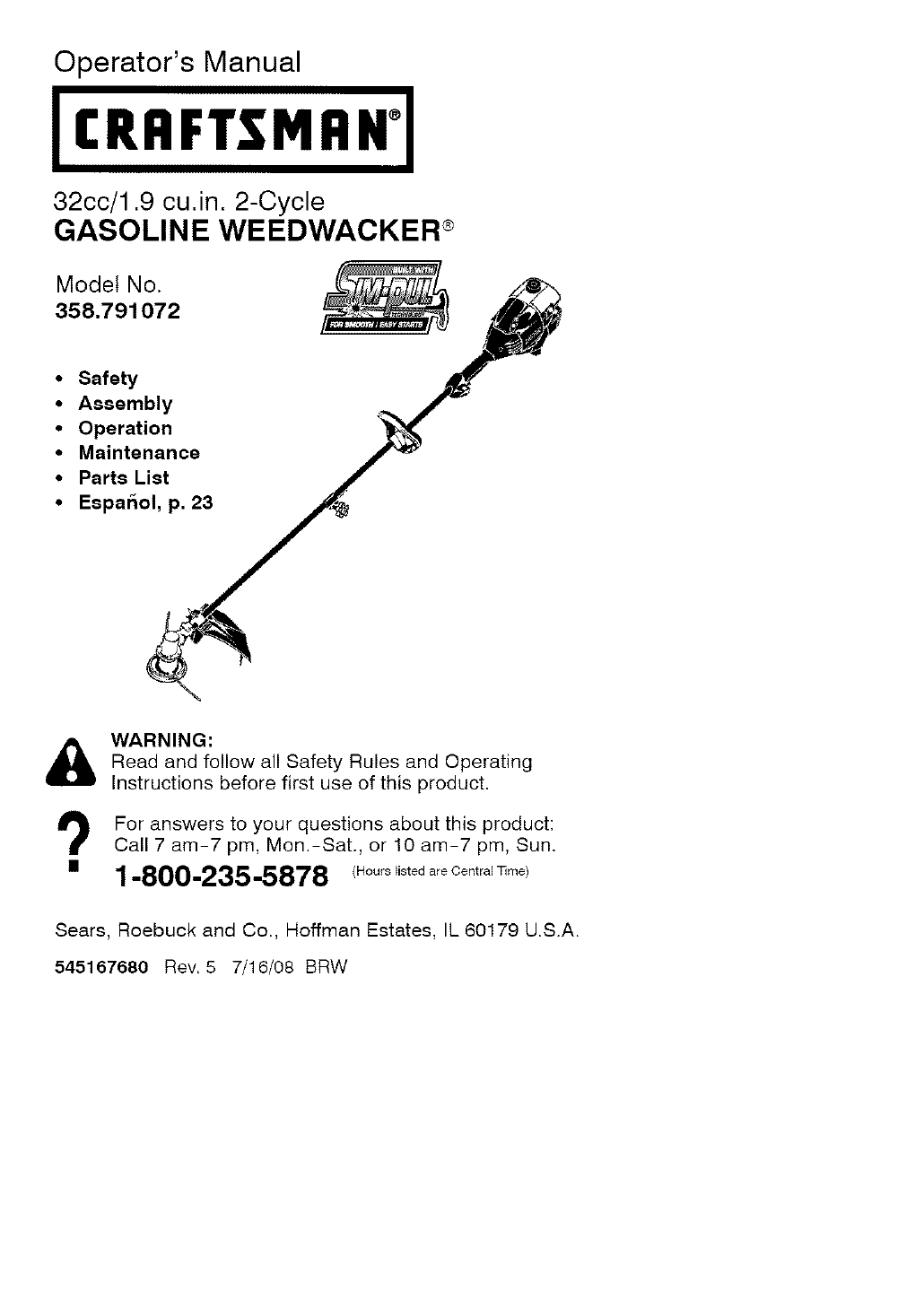 User Manual: Craftsman 358791072 358791072 CRAFTSMAN TRIMMER - Manuals and Guides View the owners manual for your CRAFTSMAN TRIMMER #358791072. Home:Lawn & Garden Parts:Craftsman Parts:358791072 Craftsman Grass trimmer (weed wacker) Manual