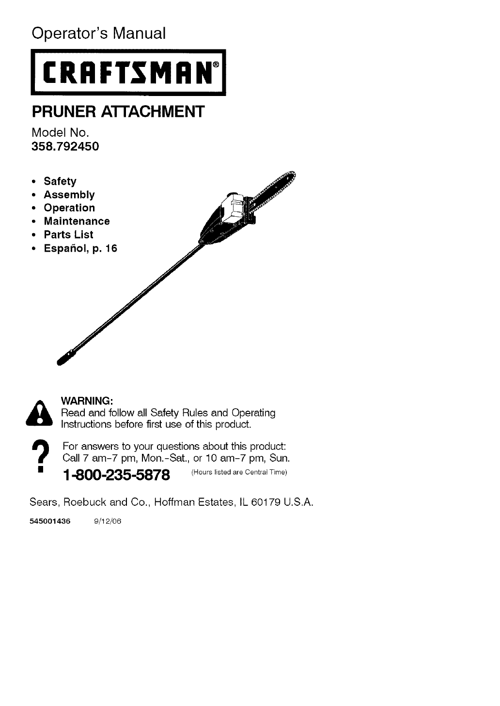 User Manual: Craftsman 358792450 358792450 CRAFTSMAN POLE PRUNER ATTACHMENT - Manuals and Guides View the owners manual for your CRAFTSMAN POLE PRUNER ATTACHMENT #358792450. Home:Lawn & Garden Parts:Craftsman Parts:Craftsman POLE PRUNER ATTACHMENT Manual
