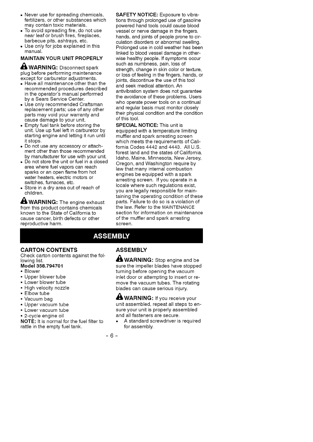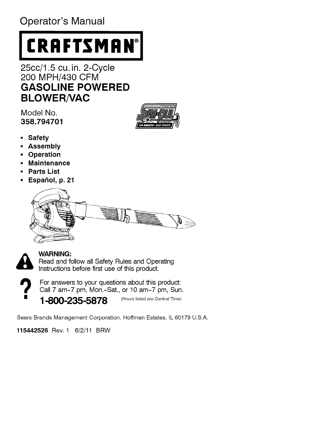 User Manual: Craftsman 358794701 358794701 CRAFTSMAN GAS BLOWER/VAC - Manuals and Guides View the owners manual for your CRAFTSMAN GAS BLOWER/VAC #358794701. Home:Lawn & Garden Parts:Craftsman Parts:Craftsman GAS BLOWER/VAC Manual