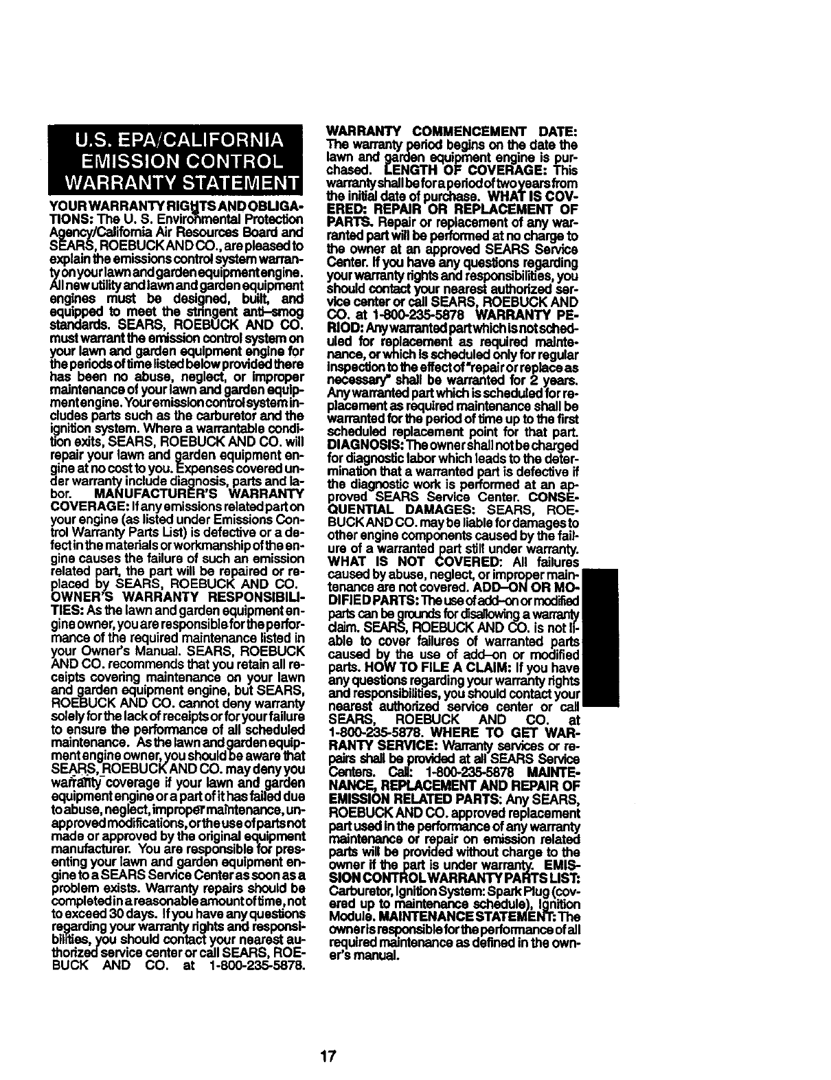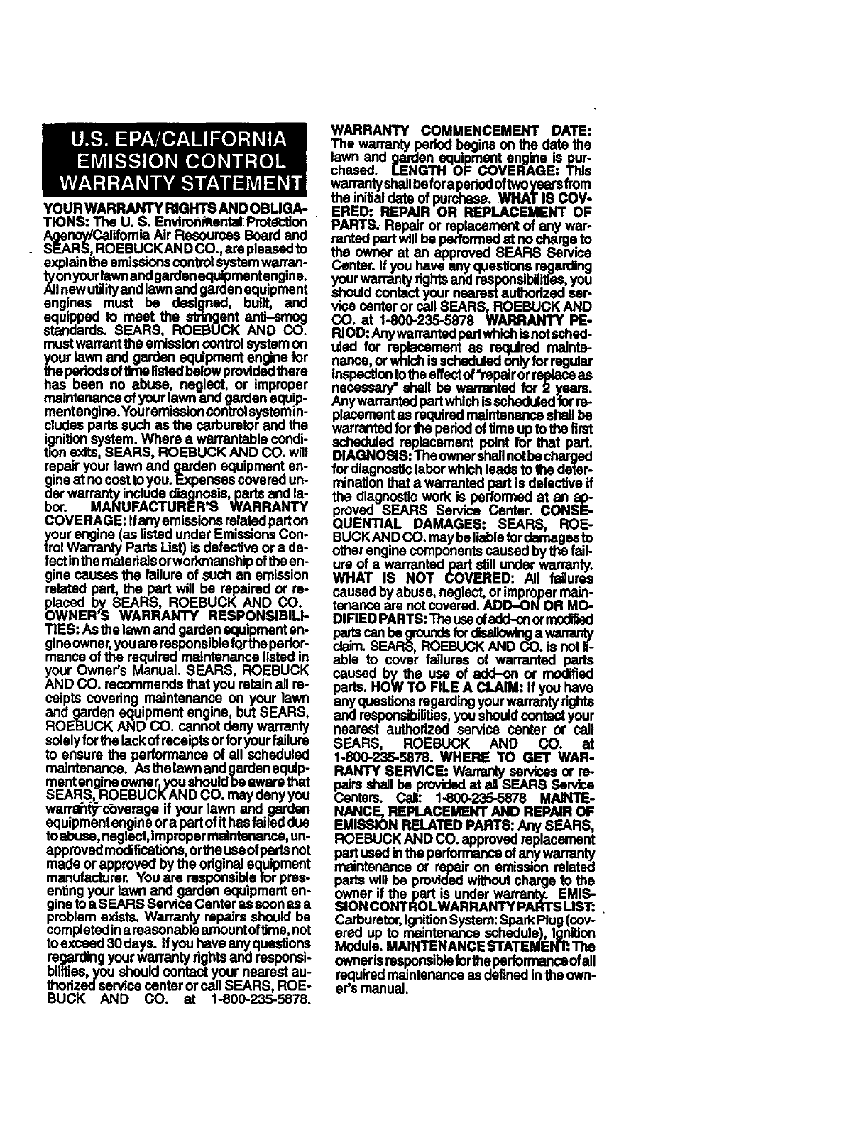 EMISSION RELATED PARTS: Any SEARS,