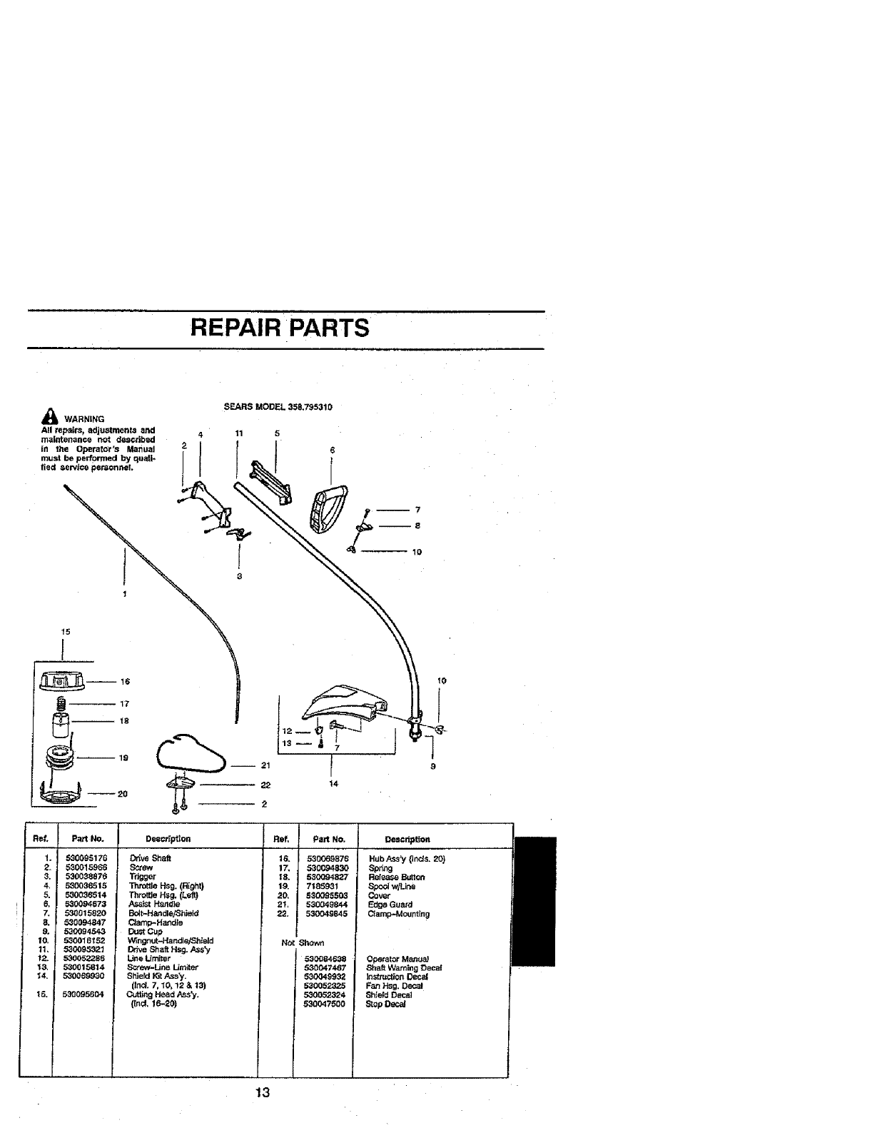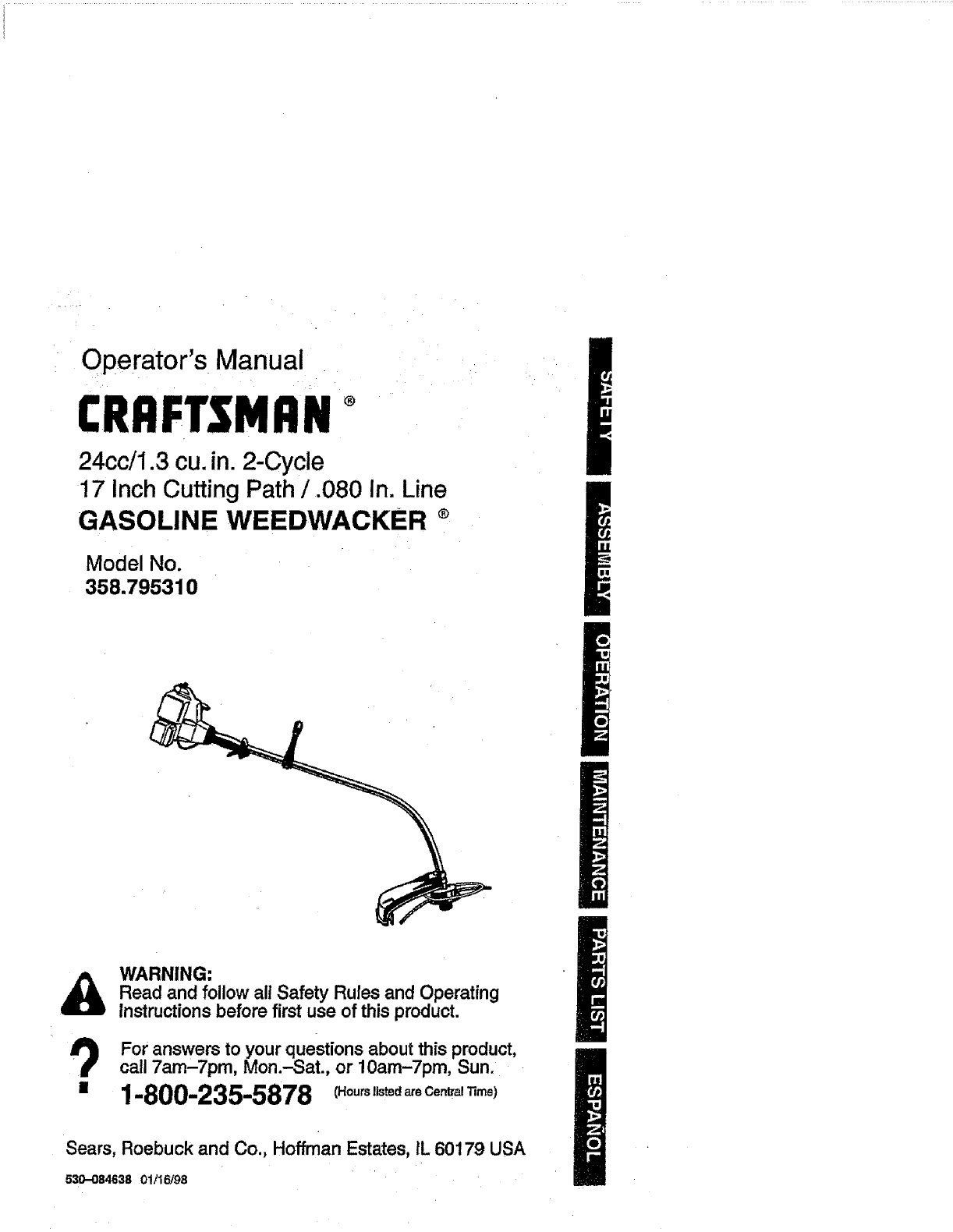 User Manual: Craftsman 358795310 358795310 CRAFTSMAN Gas, Line Trimmers/Weedwackers - Manuals and Guides View the owners manual for your CRAFTSMAN Gas, Line Trimmers/Weedwackers #358795310. Home:Lawn & Garden Parts:Craftsman Parts:358795310 Craftsman Grass trimmer (weed wacker) Manual