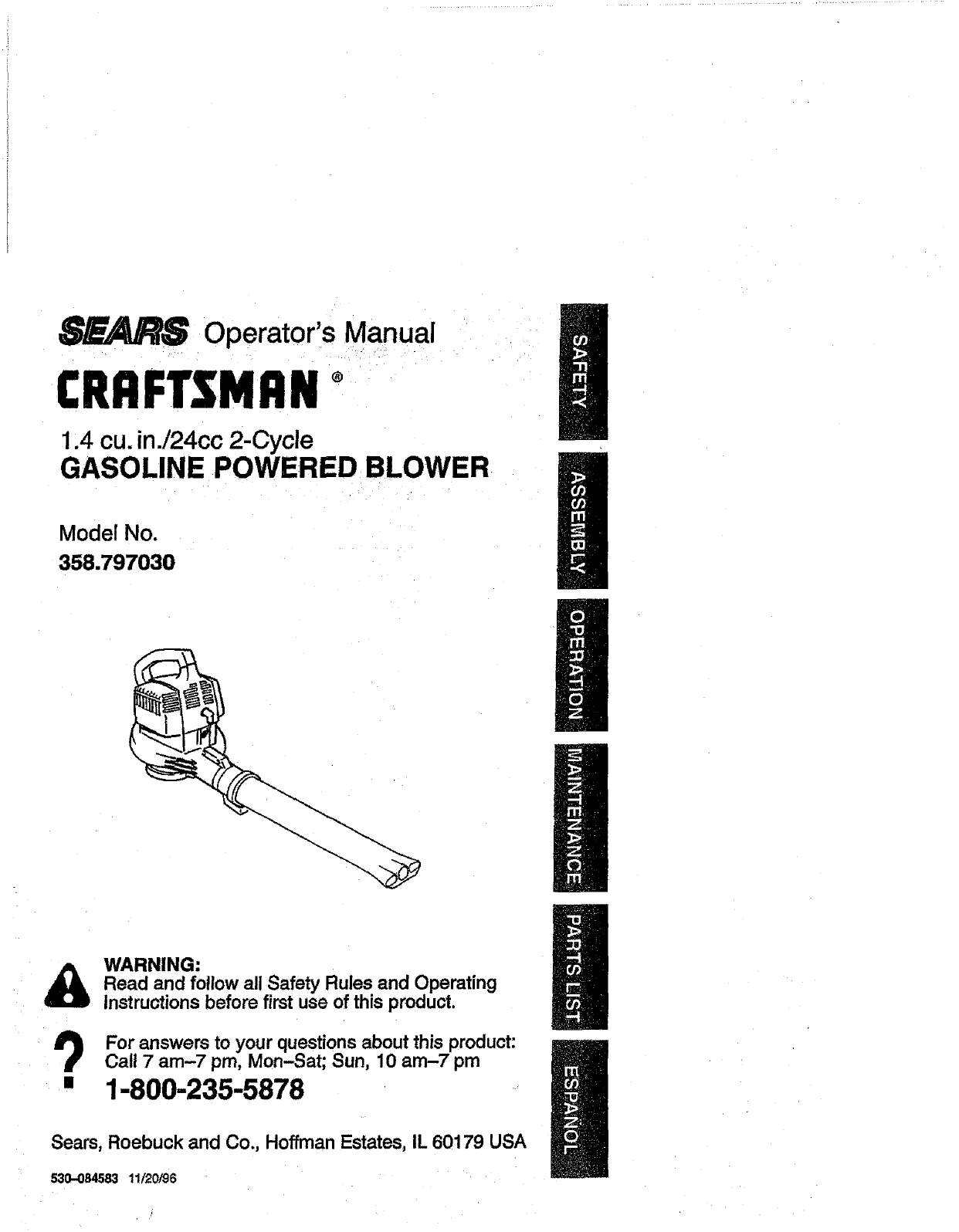 User Manual: Craftsman 358797030 358797030 CRAFTSMAN GAS BLOWER - Manuals and Guides View the owners manual for your CRAFTSMAN GAS BLOWER #358797030. Home:Lawn & Garden Parts:Craftsman Parts:Craftsman GAS BLOWER Manual