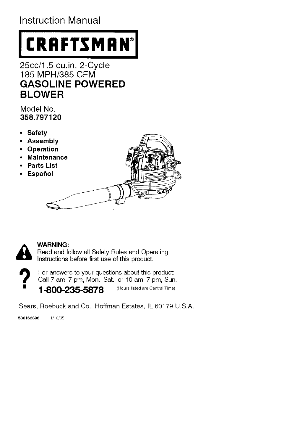 User Manual: Craftsman 358797120 358797120 CRAFTSMAN BLOWER - Manuals and Guides View the owners manual for your CRAFTSMAN BLOWER #358797120. Home:Lawn & Garden Parts:Craftsman Parts:Craftsman BLOWER Manual