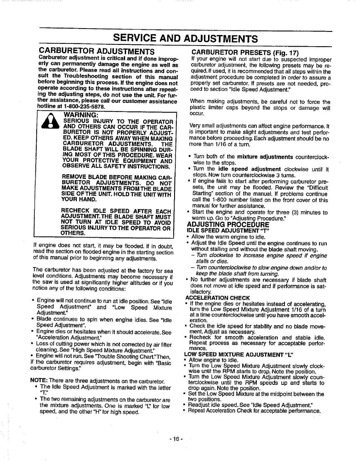 ADJUSTING OR MAKING REPAIRS EXCEPT CARBURETOR ADJUSTMENTS.