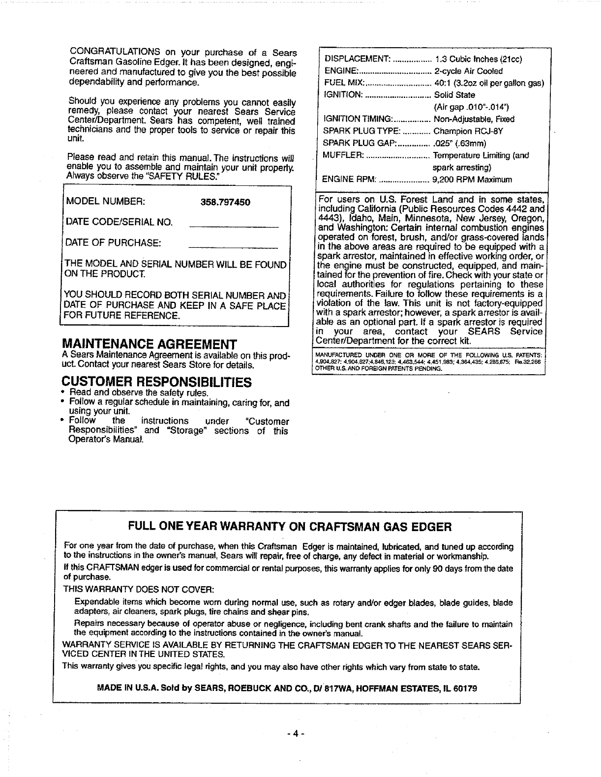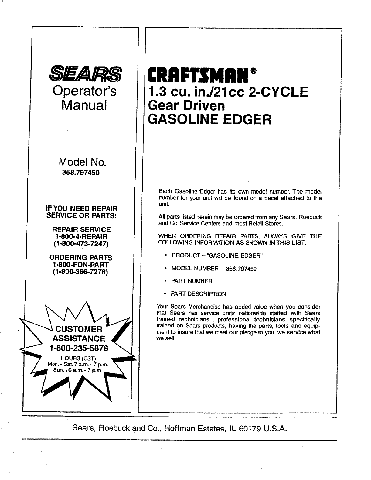 User Manual: Craftsman 358797450 358797450 CRAFTSMAN GAS EDGER - Manuals and Guides View the owners manual for your CRAFTSMAN GAS EDGER #358797450. Home:Lawn & Garden Parts:Craftsman Parts:Craftsman GAS EDGER Manual