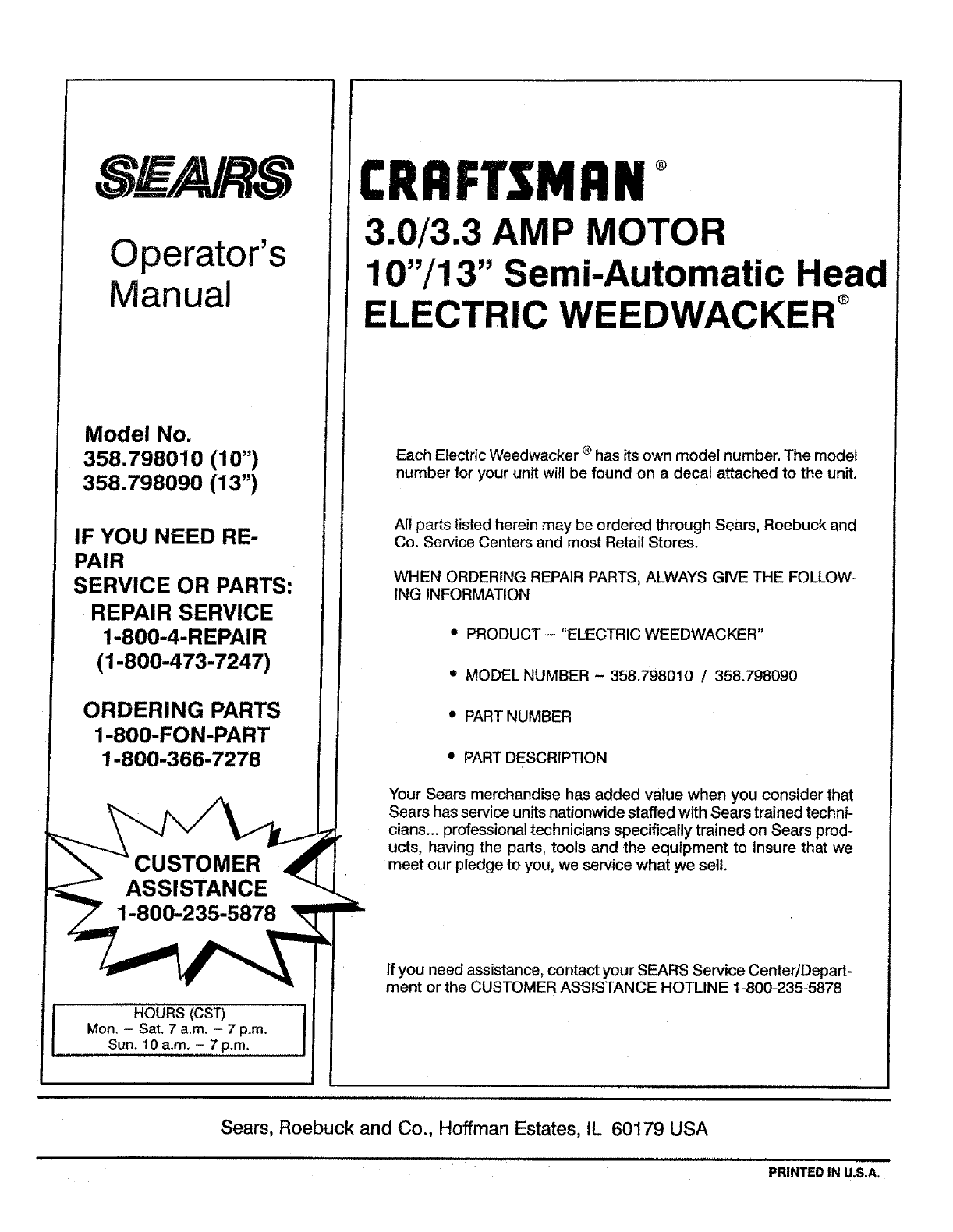 User Manual: Craftsman 358798010 358798010 CRAFTSMAN TRIMMER - Manuals and Guides View the owners manual for your CRAFTSMAN TRIMMER #358798010. Home:Lawn & Garden Parts:Craftsman Parts:358798010 Craftsman Grass trimmer (weed wacker) Manual