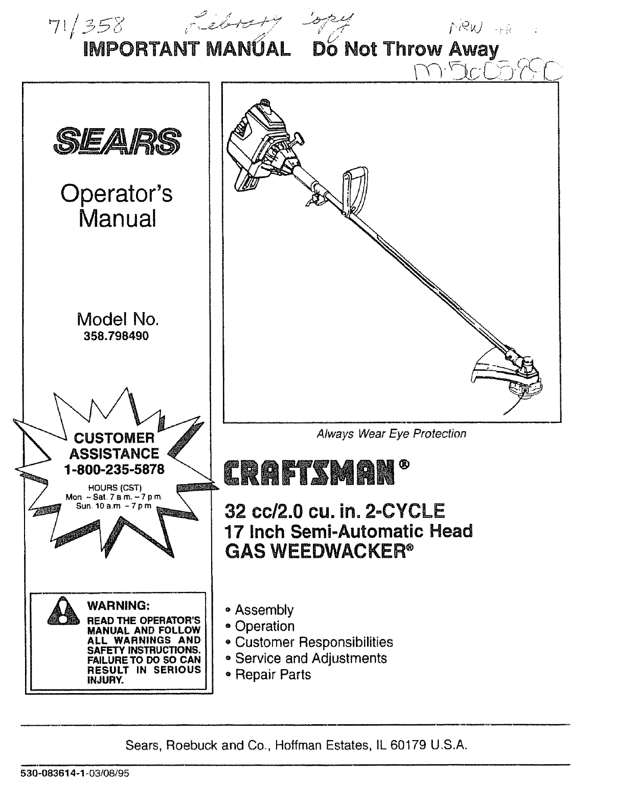 User Manual: Craftsman 358798490 358798490 CRAFTSMAN Line Trimmer/Weedwacker/Brushwacker/Brush Cutter* - Manuals and Guides View the owners manual for your CRAFTSMAN Line Trimmer/Weedwacker/Brushwacker/Brush Cutter* #358798490. Home:Lawn & Garden Parts:Craftsman Parts:358798490 Craftsman Grass trimmer (weed wacker) Manual