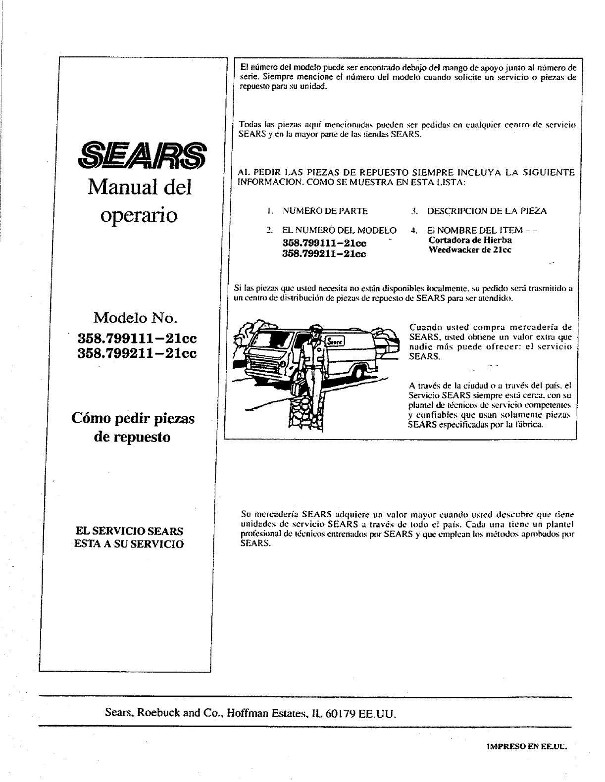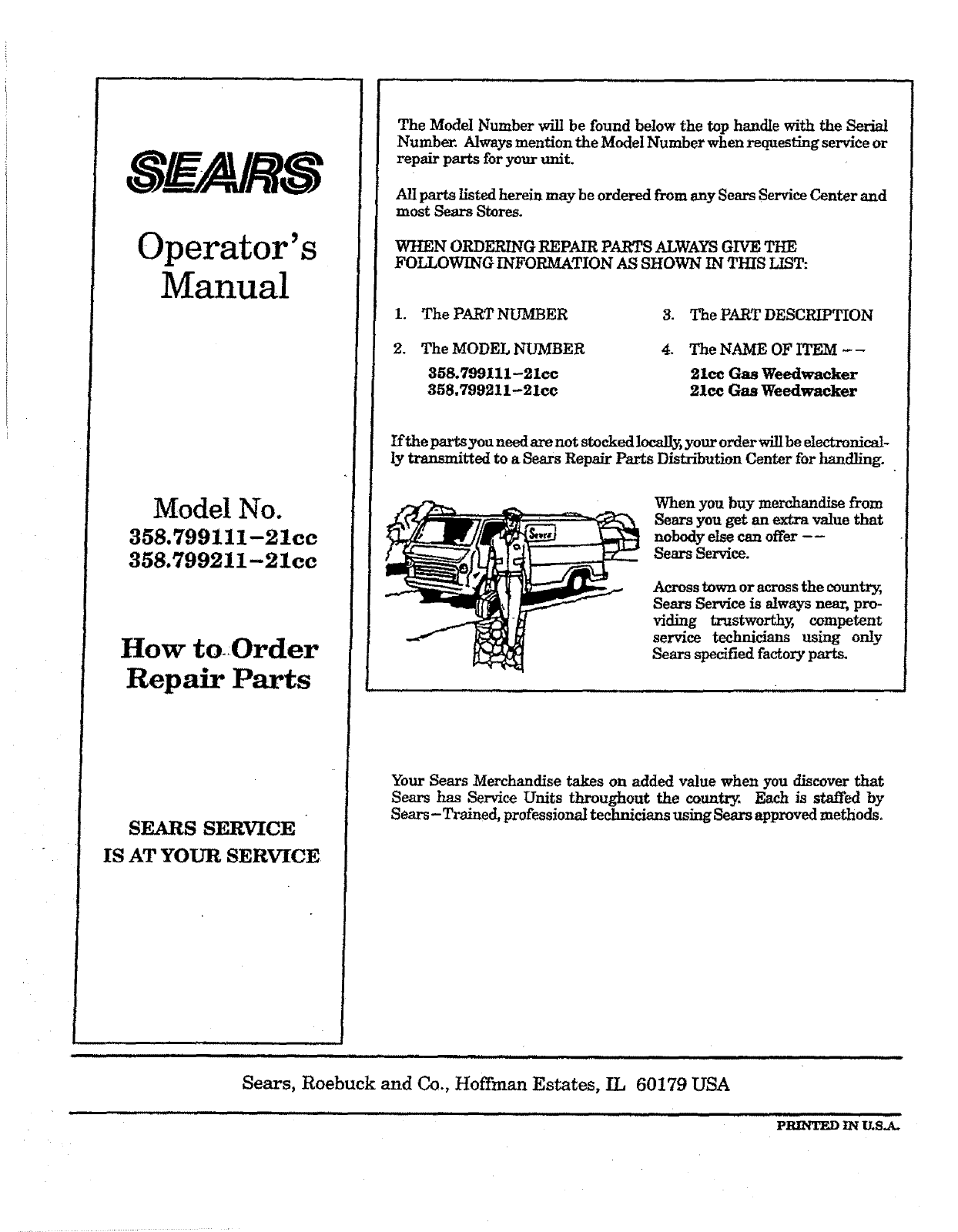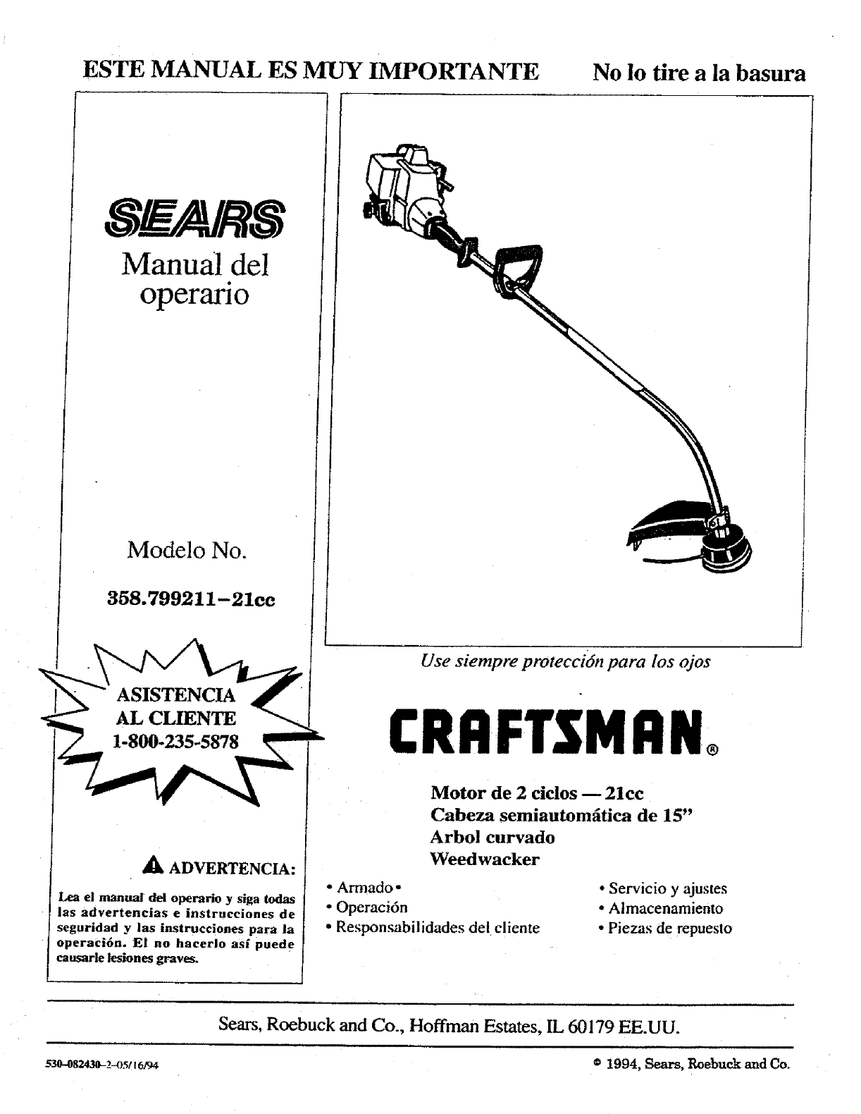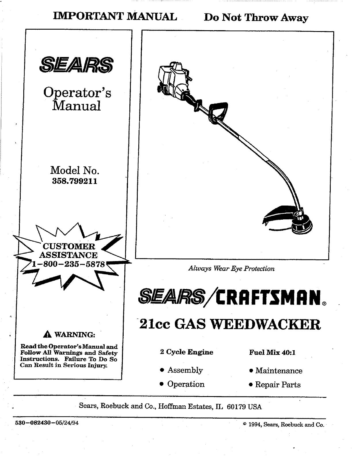 User Manual: Craftsman 358799211 358799211 CRAFTSMAN WEEDWACKER - Manuals and Guides View the owners manual for your CRAFTSMAN WEEDWACKER #358799211. Home:Lawn & Garden Parts:Craftsman Parts:358799211 Craftsman Grass trimmer (weed wacker) Manual