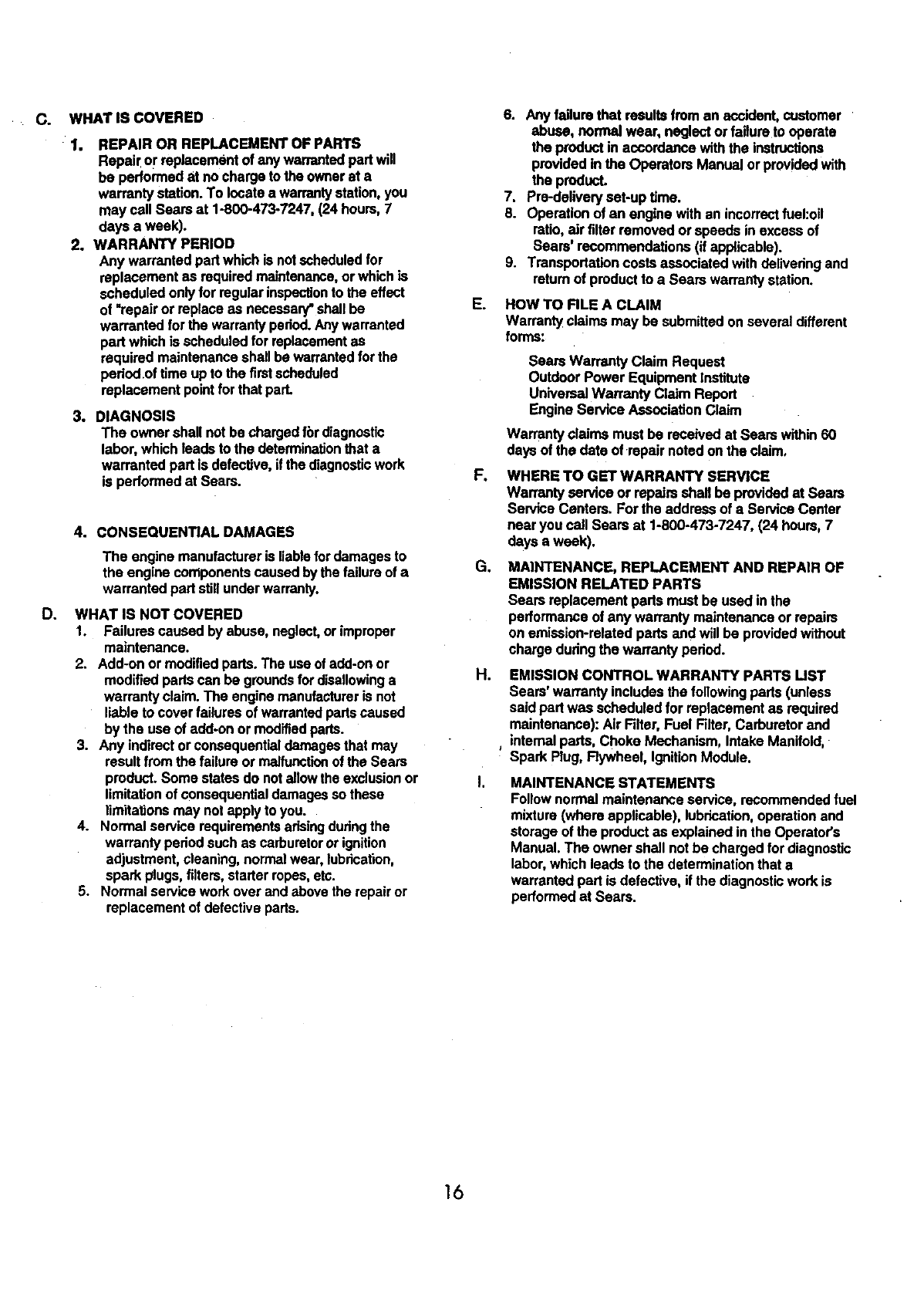 instructions in the Operator's Manual, Sears will repair or replace, free of charge, any parts found to be defective in