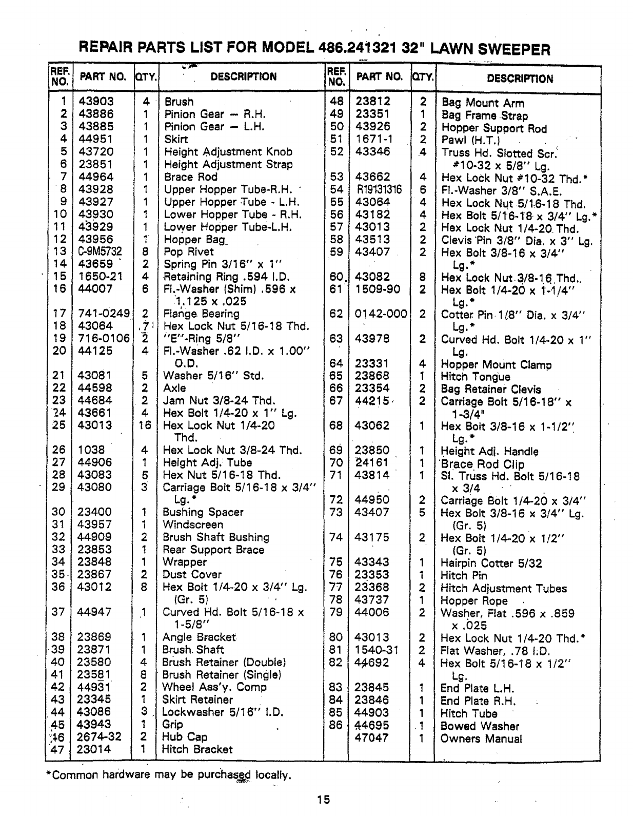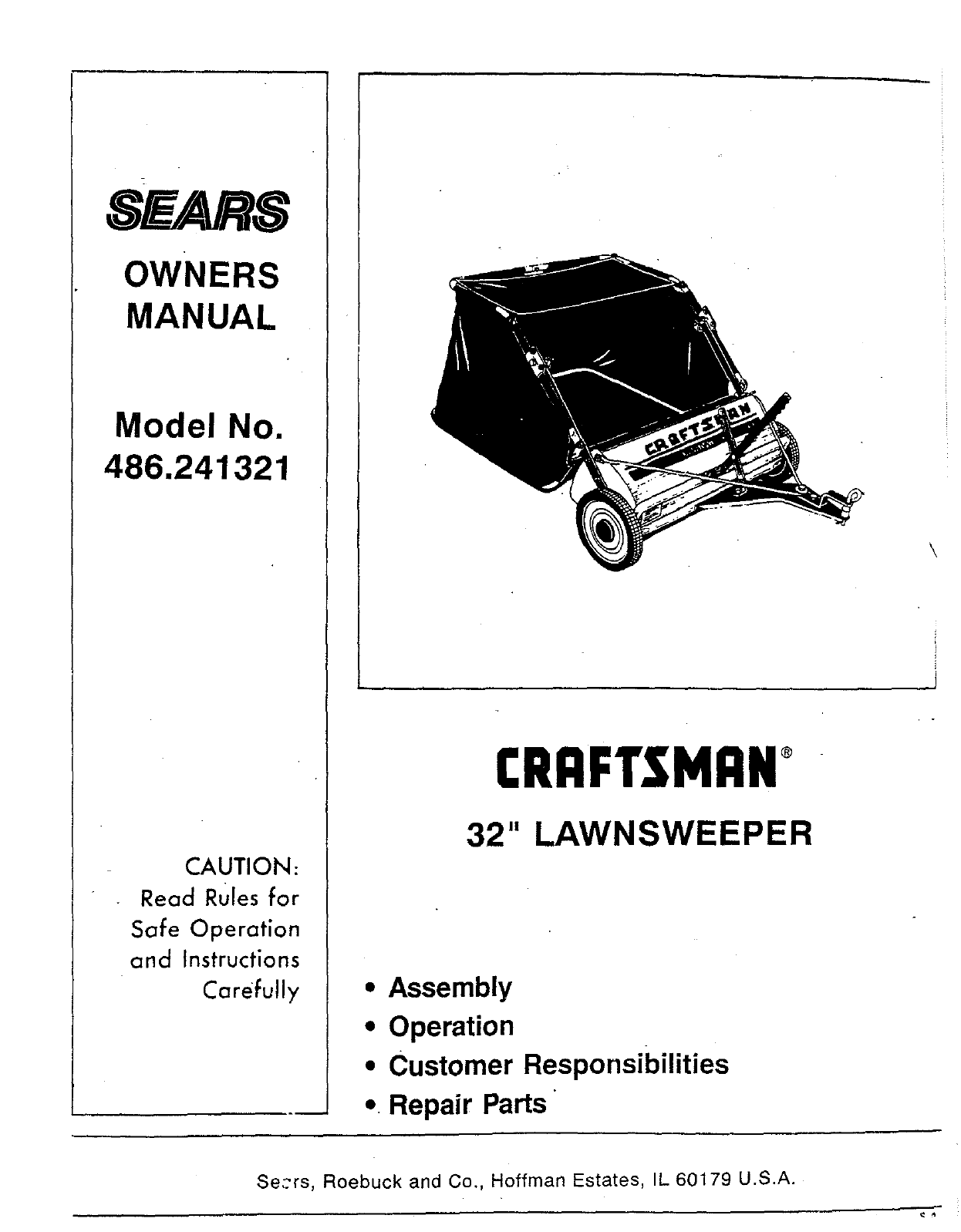 User Manual: Craftsman 486241321 486241321 CRAFTSMAN LAWN SWEEPER - Manuals and Guides View the owners manual for your CRAFTSMAN LAWN SWEEPER #486241321. Home:Lawn & Garden Parts:Craftsman Parts:Craftsman LAWN SWEEPER Manual