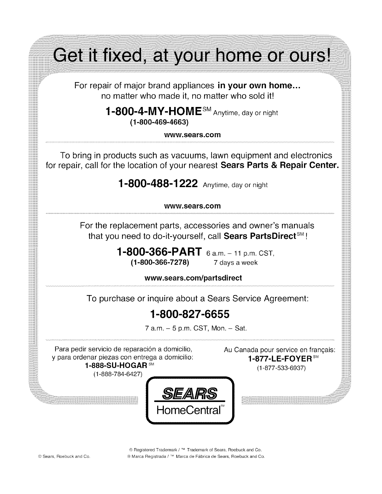 TO purchase °r 'nq-uire tb°ut _ Sears ServiceAgreement:l800 827 6655