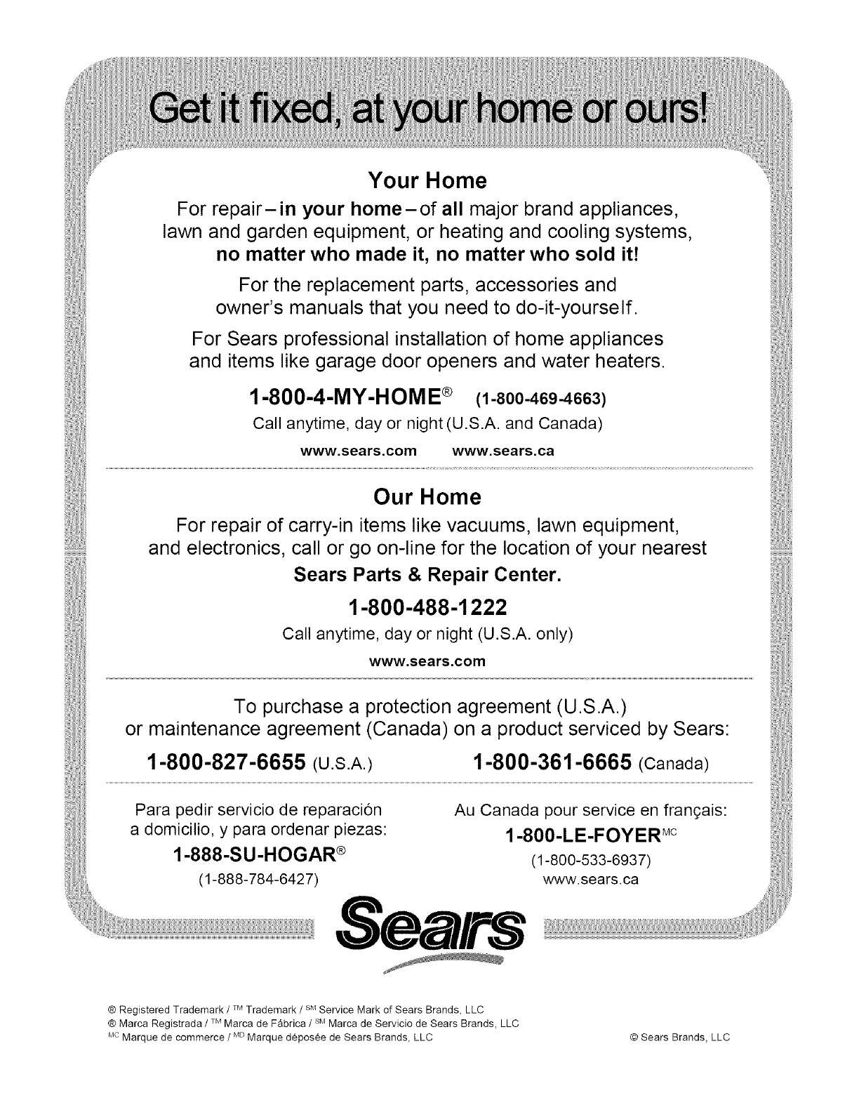 (1-888-784-6427) www.sears.ca