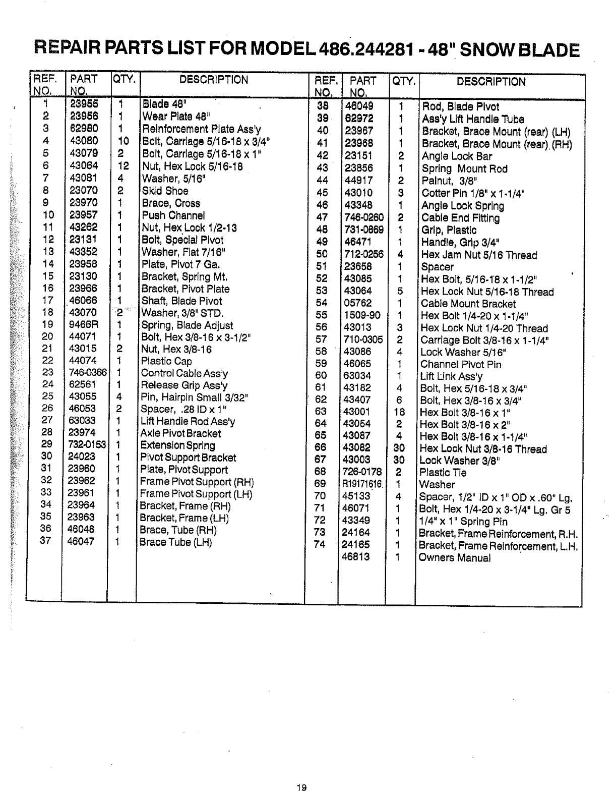 REPAIR PARTS LIST FOR MODEL 486.244281 -48" SNOW BLADE
