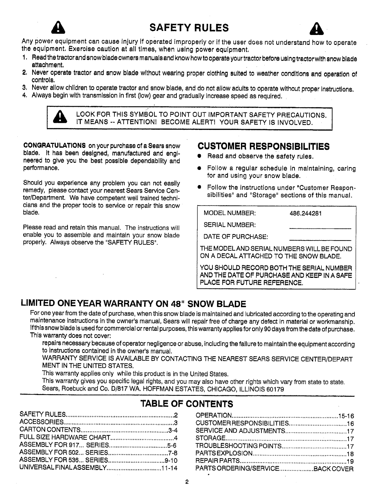 User Manual: Craftsman 486244281 486244281 CRAFTSMAN 48 SNOW BLADE - Manuals and Guides View the owners manual for your CRAFTSMAN 48 SNOW BLADE #486244281. Home:Lawn & Garden Parts:Craftsman Parts:Craftsman 48 SNOW BLADE Manual
