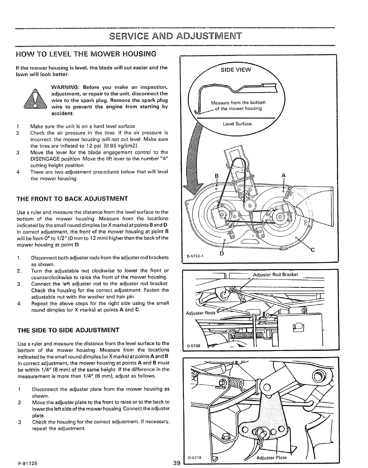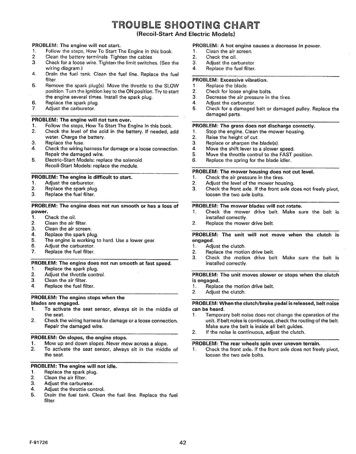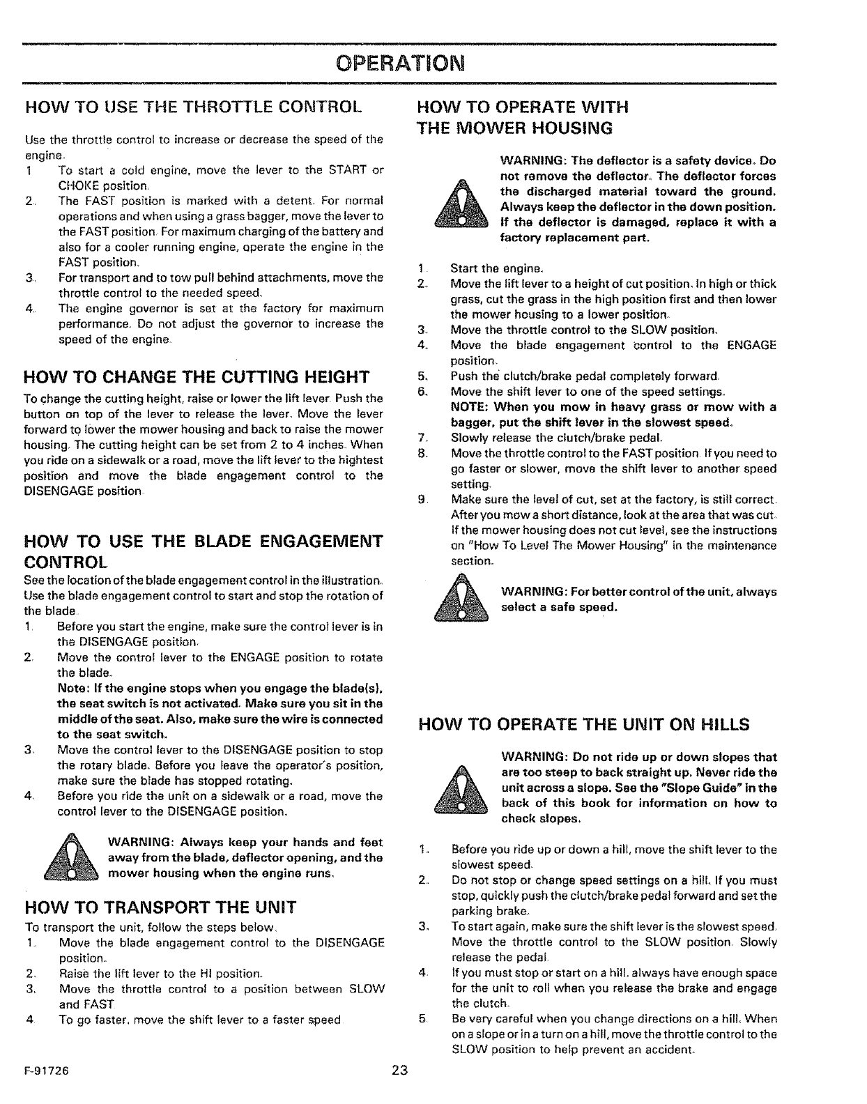 8Avoid starting or stopping on aslope. If tires lose traction, disengage the blades and proceed slowly straight down the slope,