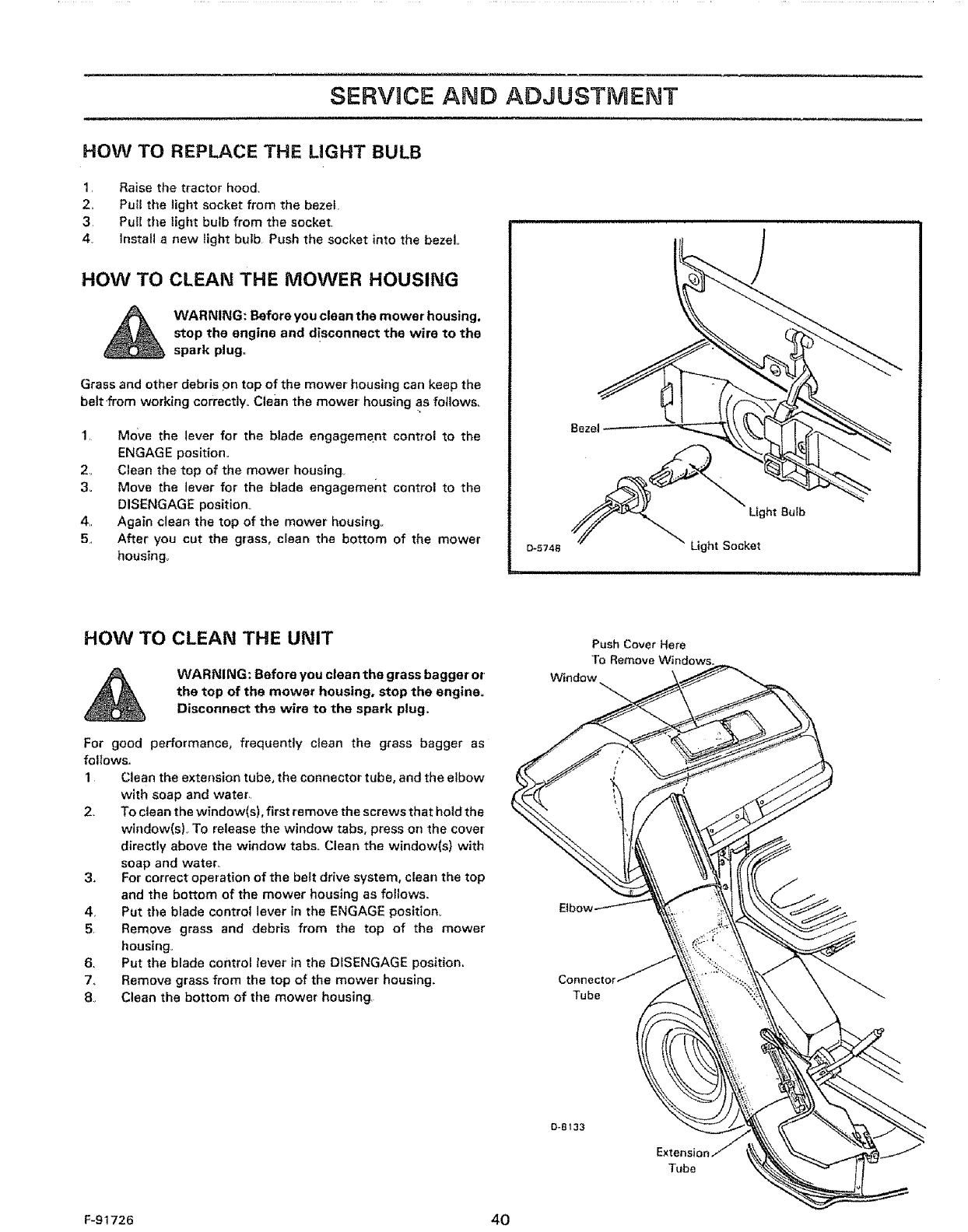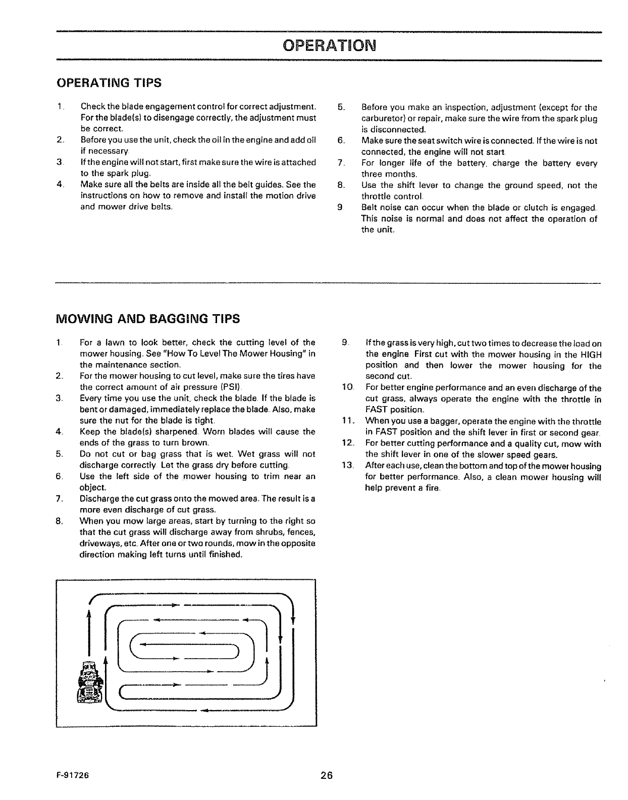12. Stop the engine before removing the grass bagger or unclogging the chute.