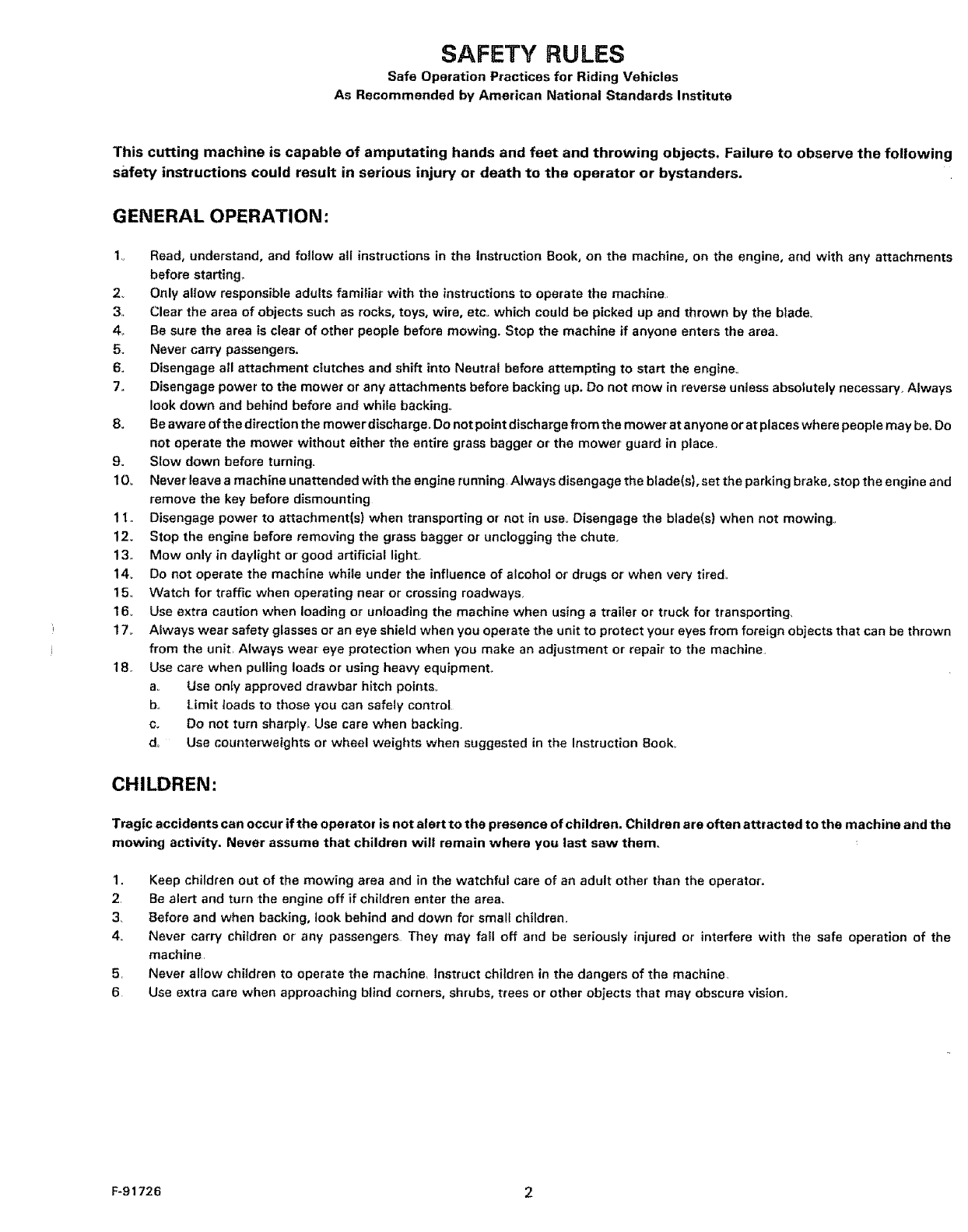 Tragic accidents can occur if the operator is not alert to the presence of children, Children are often attracted to the machine and the