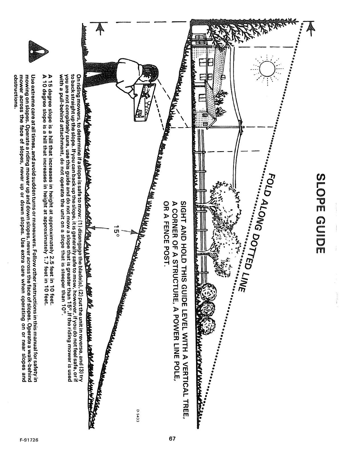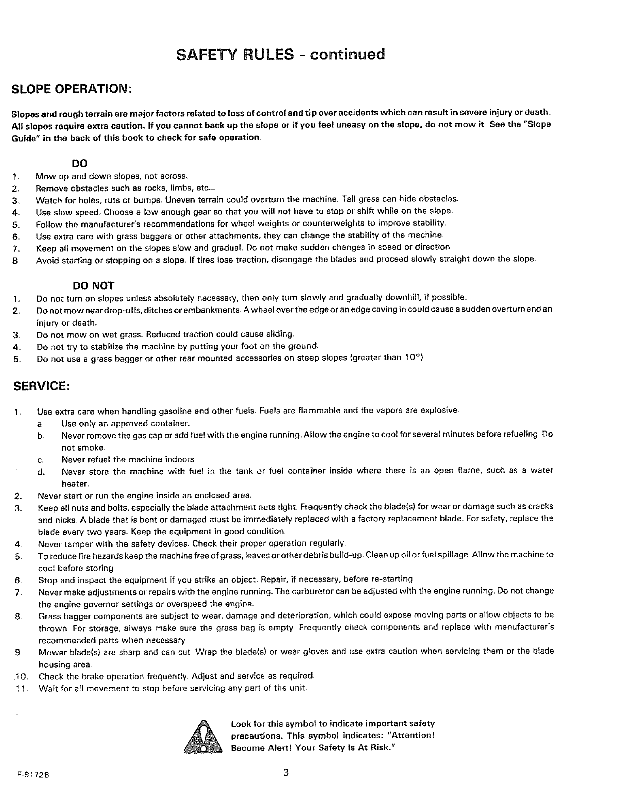 All slopes require extra caution. If you cannot back up the slope or if you feet uneasy on the slope, do not mow ito See the "Slope