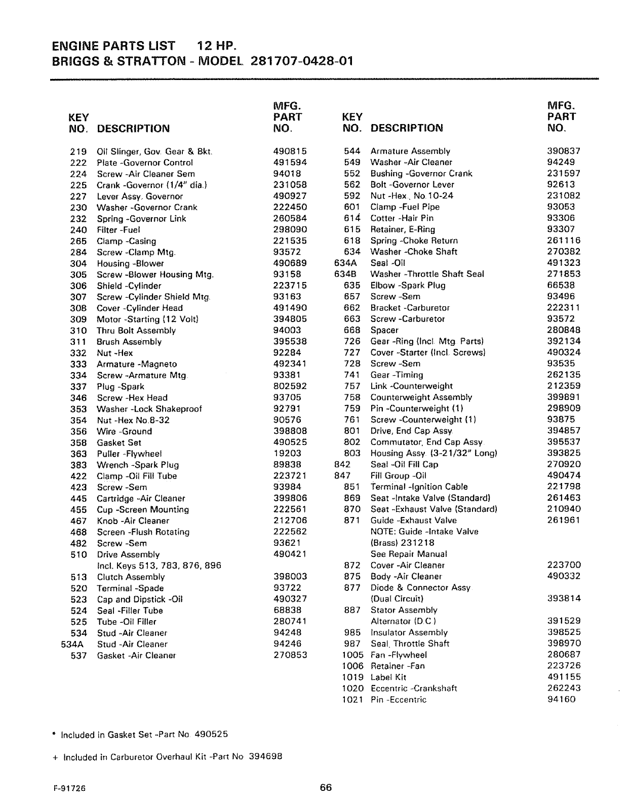 + Included in Carburetor Overhaul Kit _Part No 394698