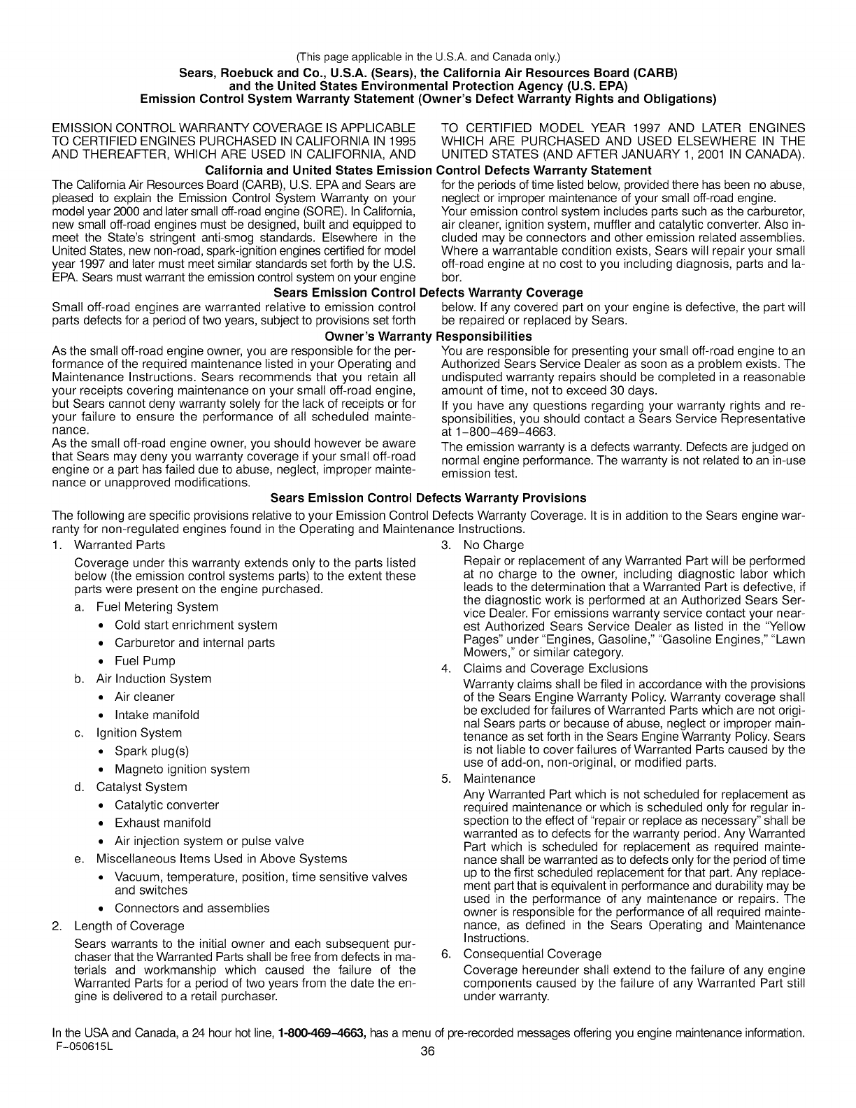 according to the instructions in the owner's manual, Sears wilt repair or replace free of charge any parts that are found to be