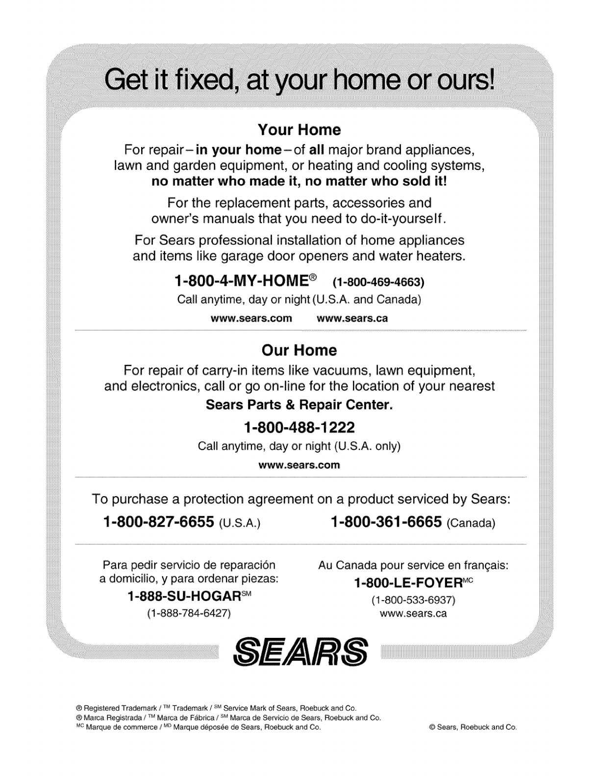 authorized Sears location, please call 1-800-4-MY-HOME®. This warranty applies only while this product is within the United