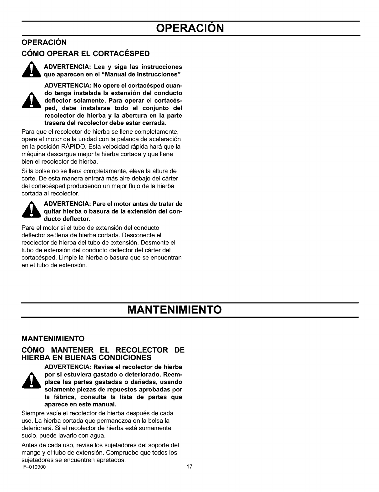 ADVERTENCIA: Revise el recolector de hierba
