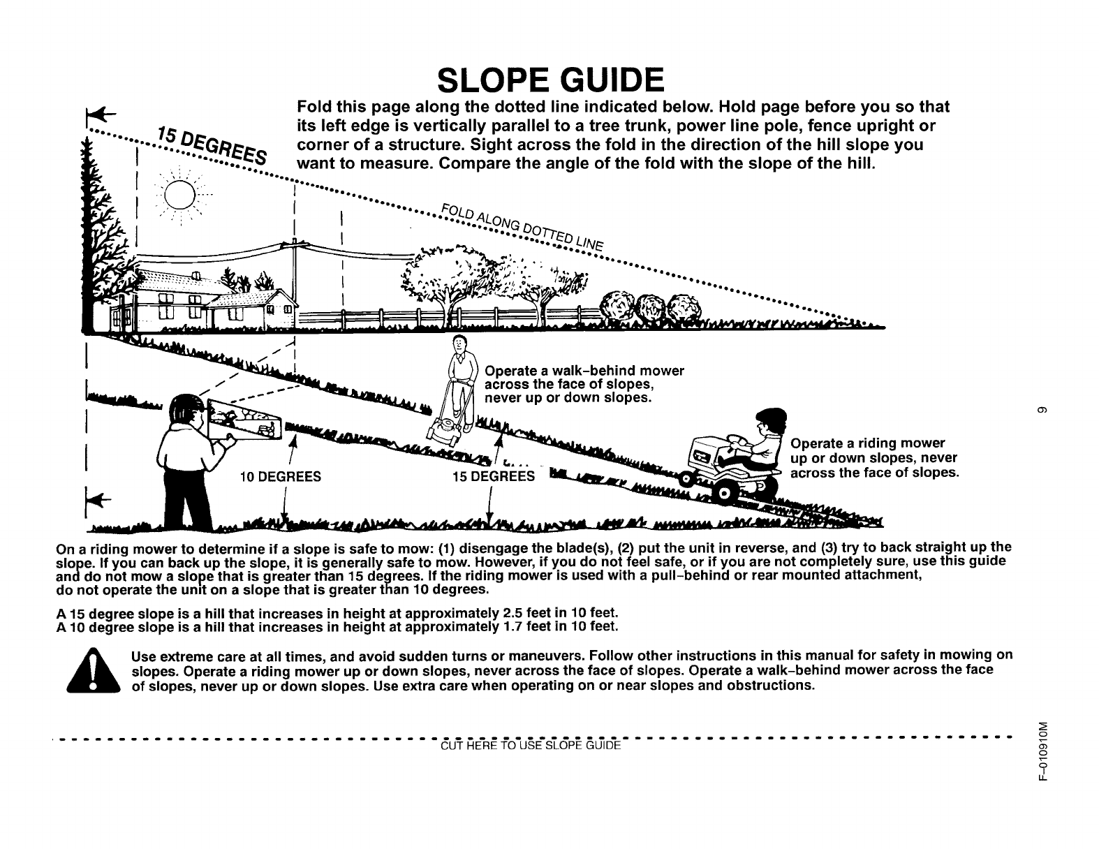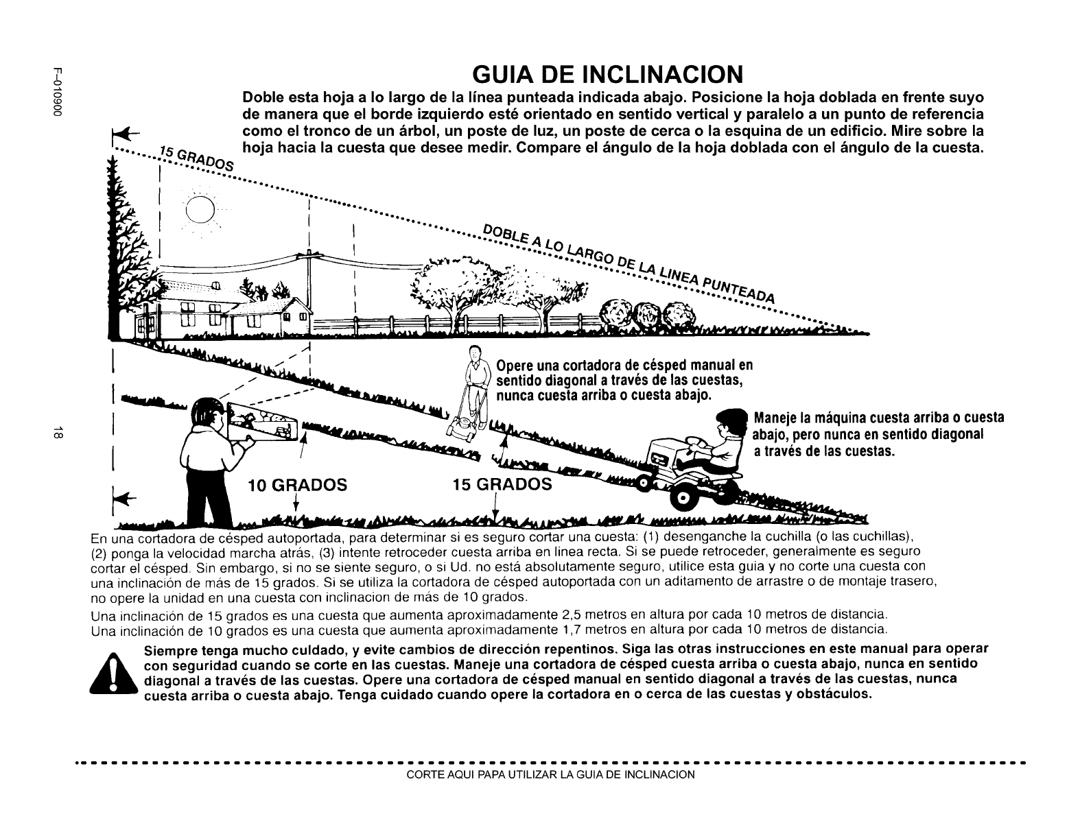 cortar el cesped. Sin embargo, si no se siente seguro, o si Ud. no est,_ absolutamente seguro, utilice esta guia y no corte una cuesta con